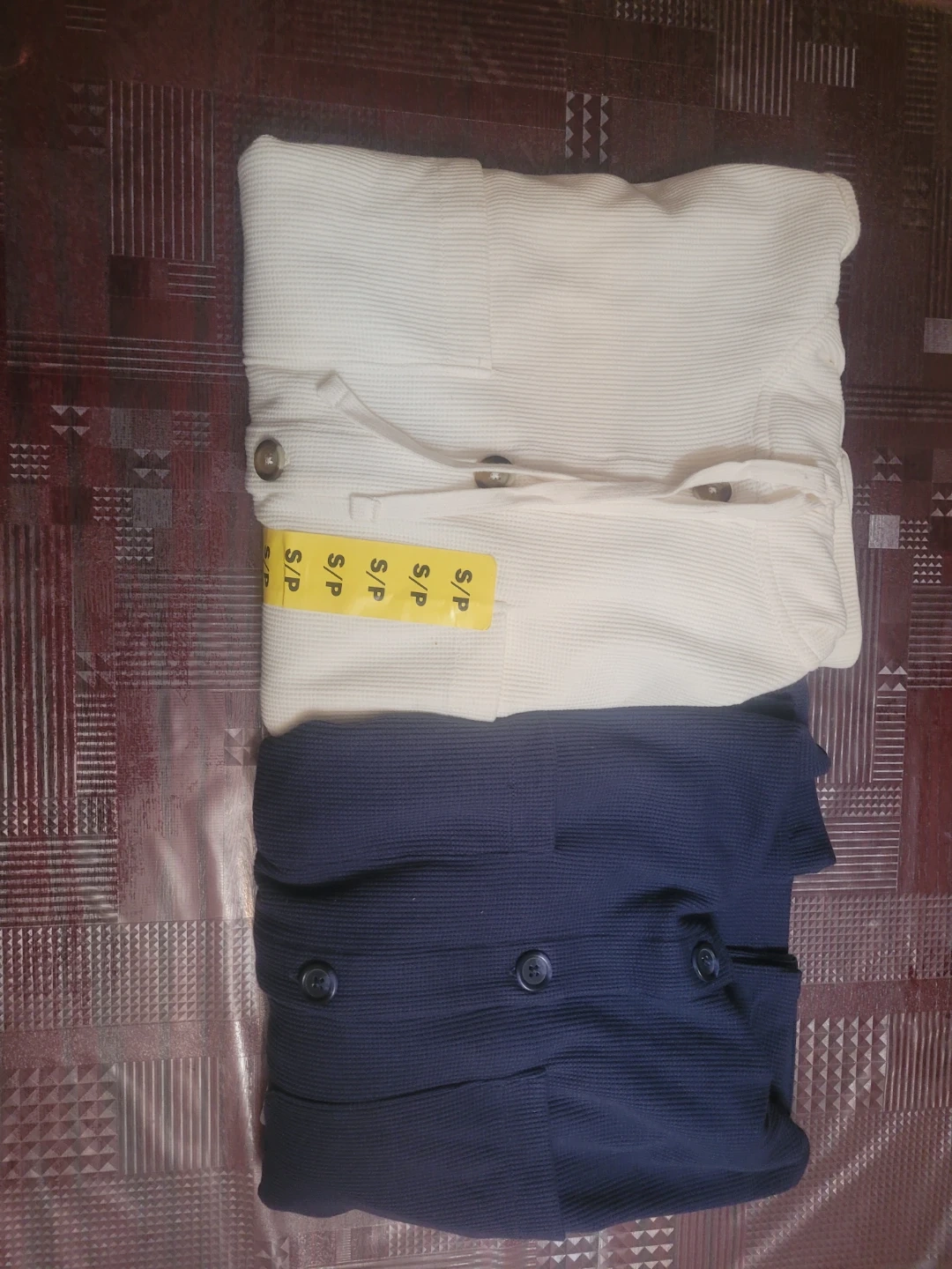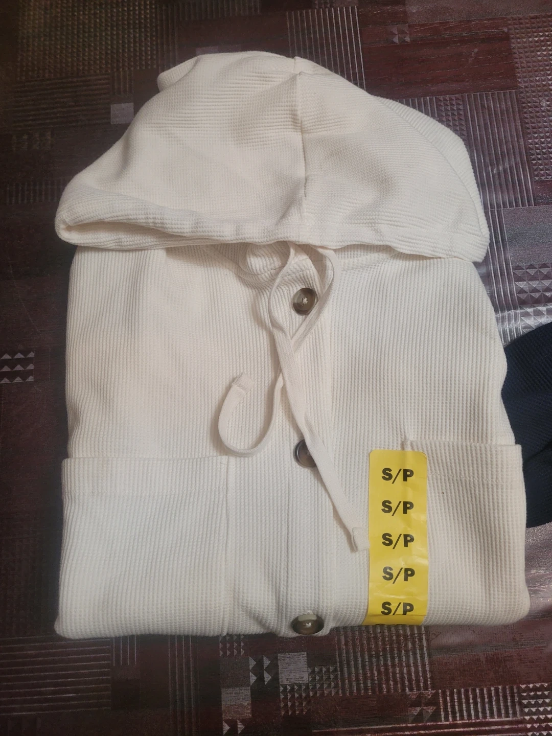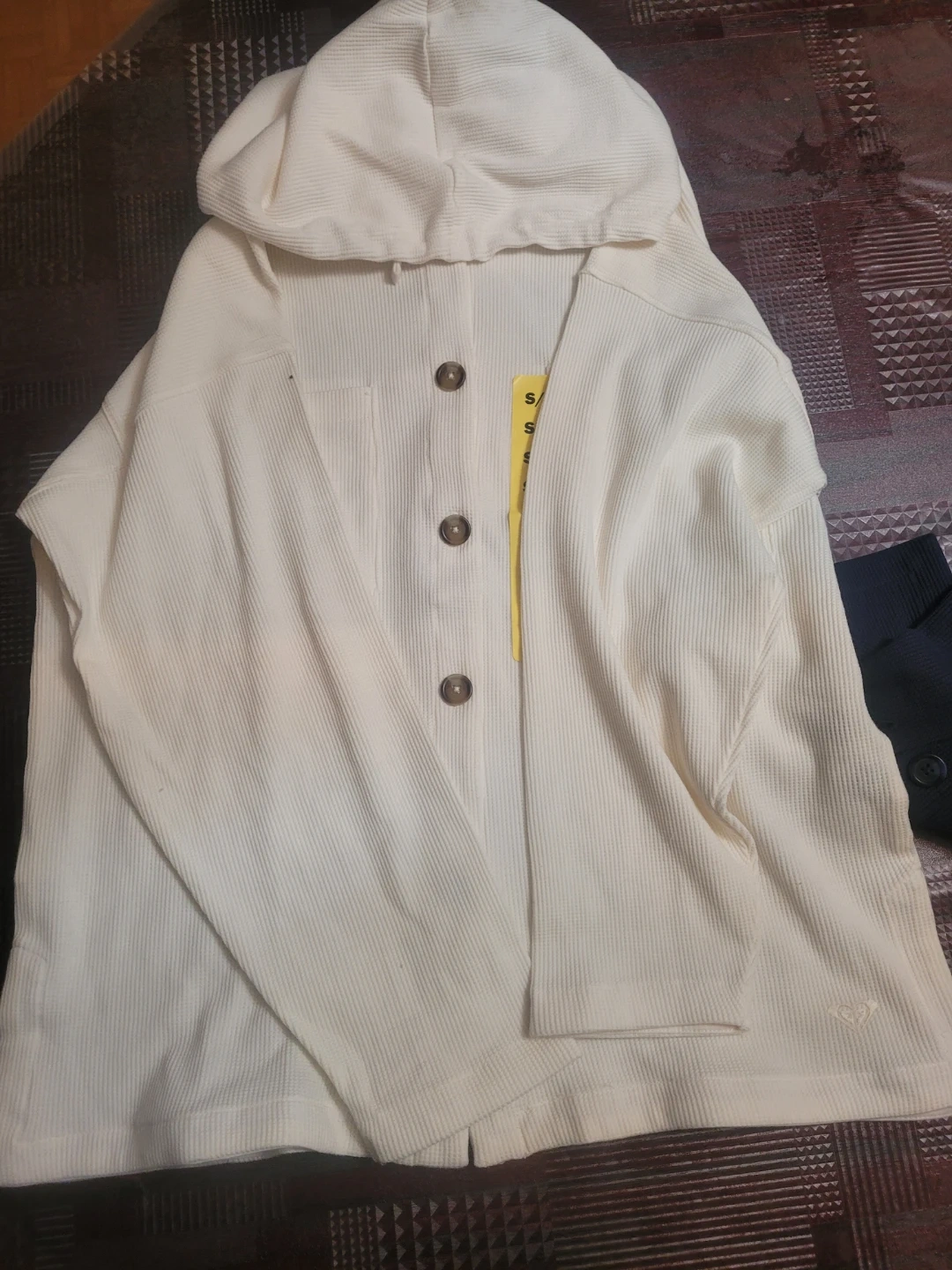 Cozy cream-coloured hooded cardigan with a waffle knit texture. It features button closures and a drawstring hood. This size small cardigan is perfect for layering on cooler days.