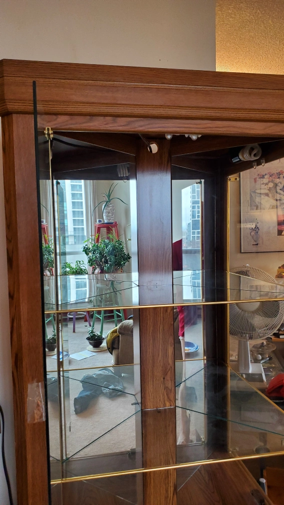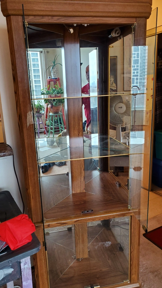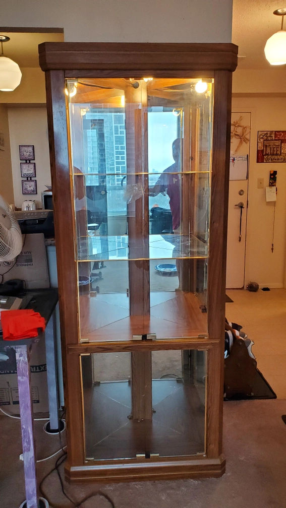 Dark brown wooden corner curio cabinet. Features glass shelves, mirrored back panels and interior lighting. Glass doors. Good for displaying collectibles.