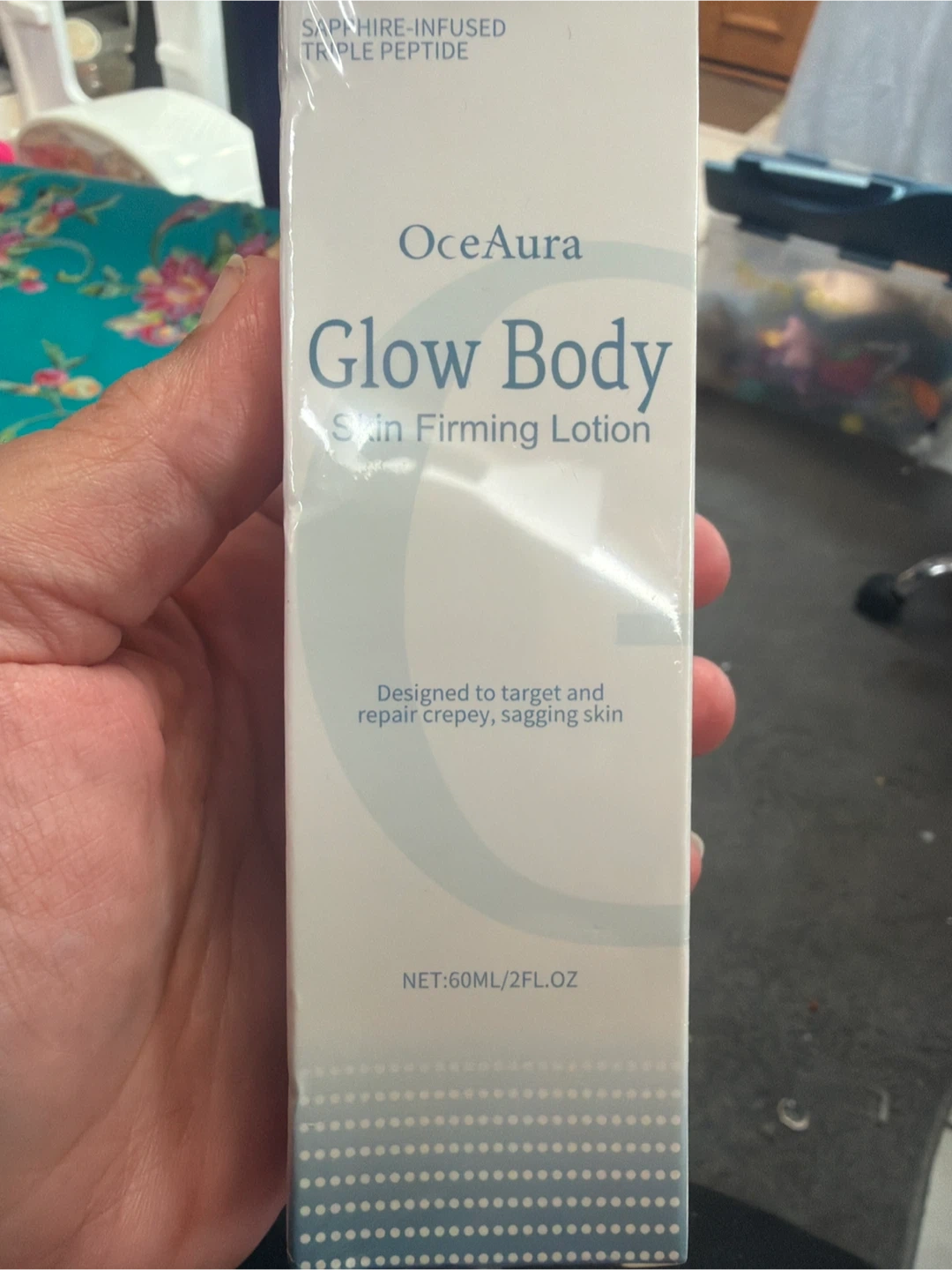This is OceAura Glow Body Skin Firming Lotion. It contains sapphire-infused triple peptide. Net content is 60ml (2 fl oz).
