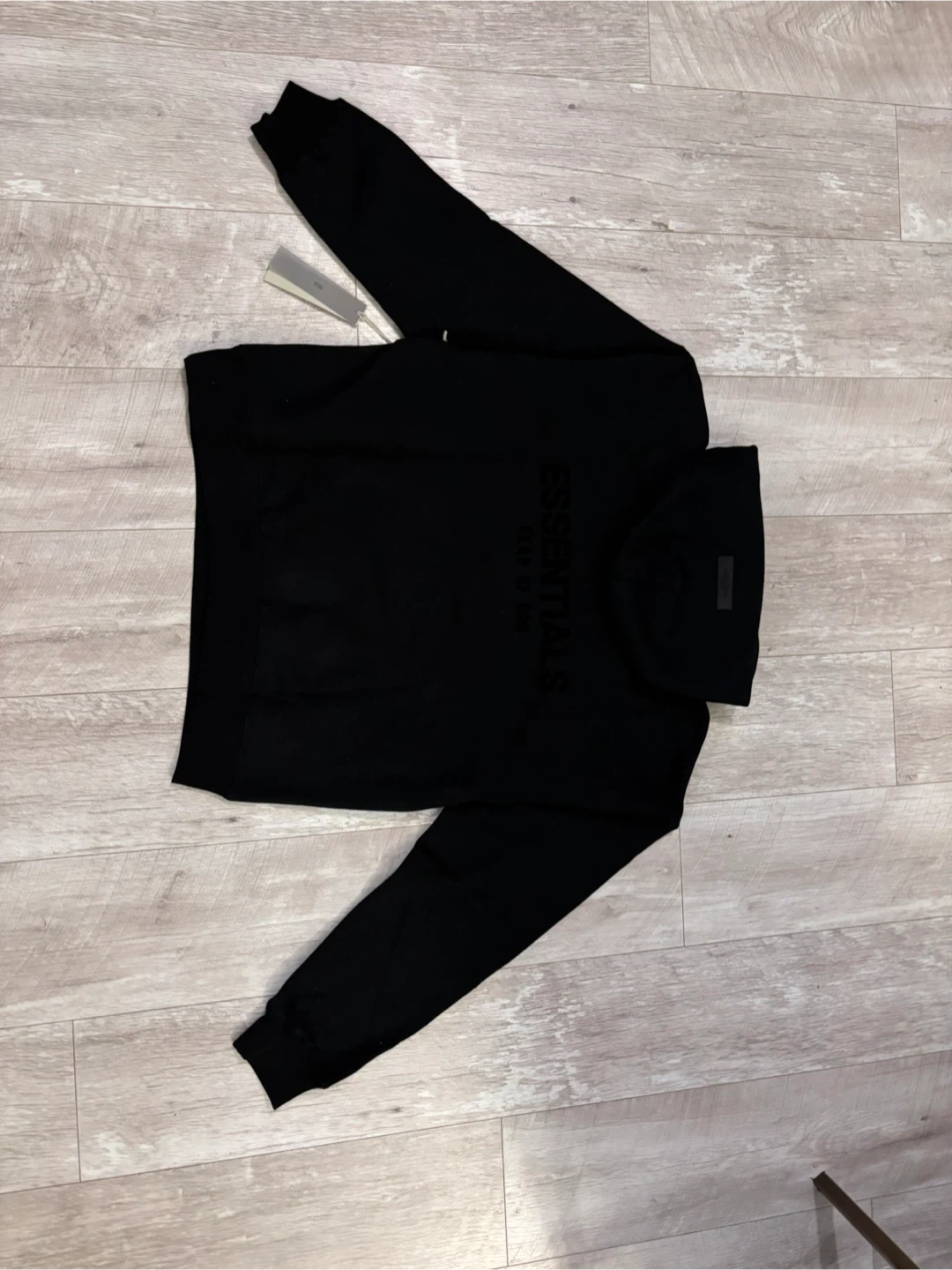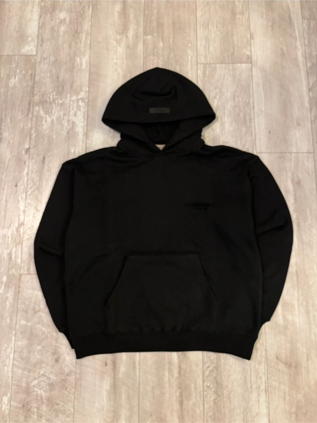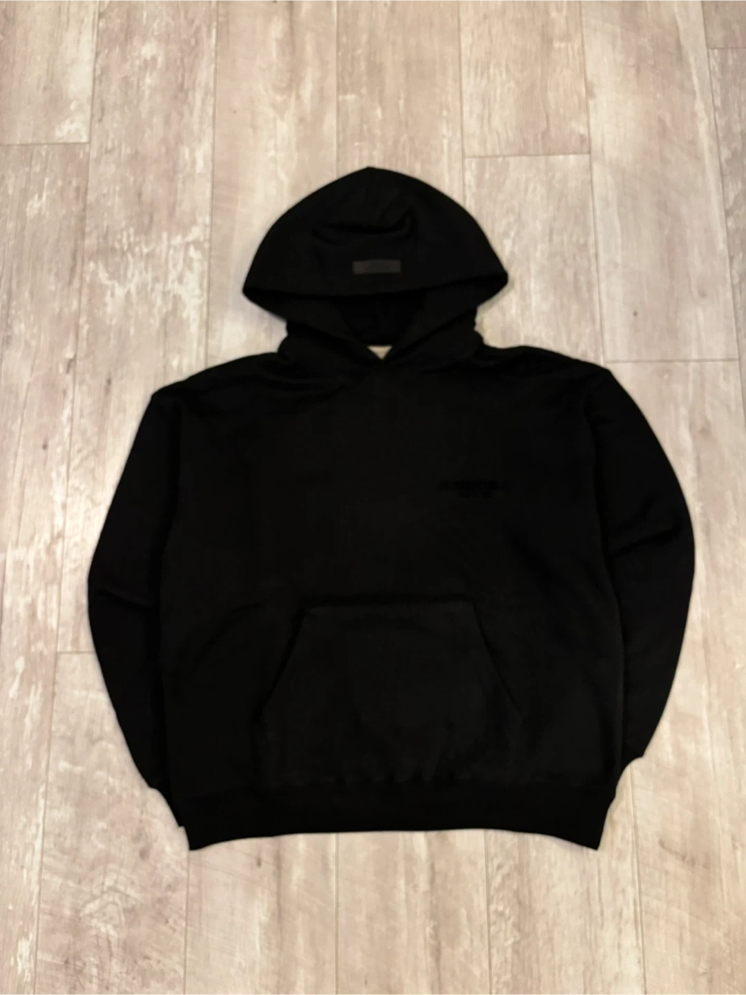Selling a black Essentials Fear of God hoodie. It's in great condition and ready for a new owner! This hoodie is a classic and versatile piece for any wardrobe