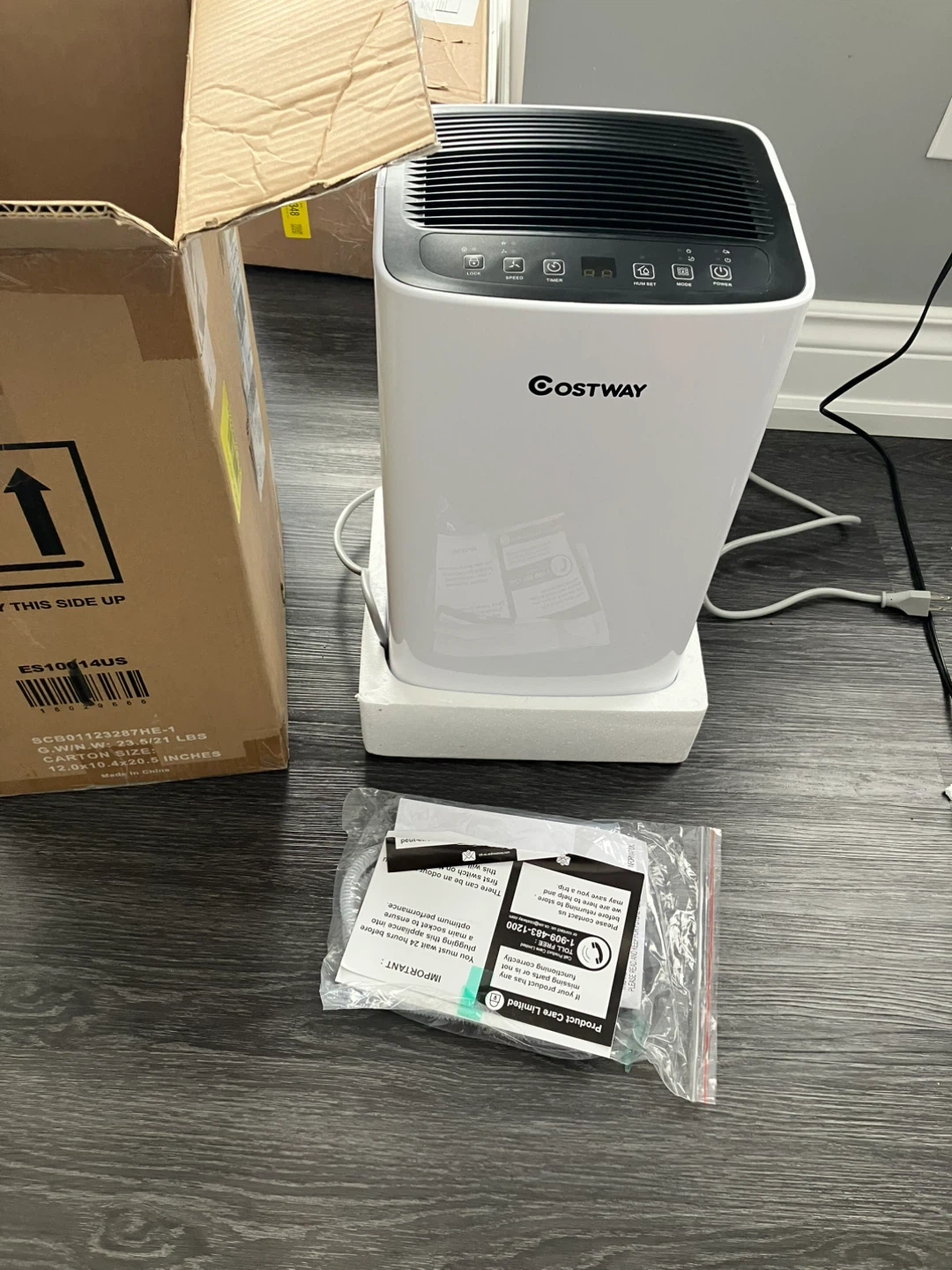 Costway dehumidifier, model ES10014US/OL12D-D023A. Power consumption 135W/1.5A at 65°F, 60%RH. Dehumidify capacity 9 pints/Day at 65°F, 60%RH. Includes original box and manual.