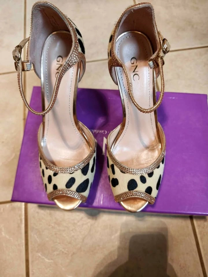 Sparkly GNC heels with a fun leopard print design. Features a peep toe style with ankle straps. The straps and trim have pretty glitter details.