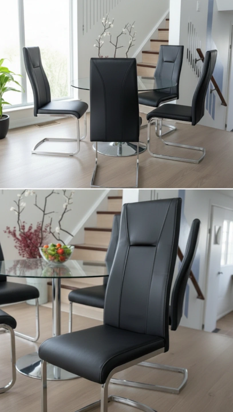 These sleek dining chairs (set of 4) features black leatherette upholstery with a supportive, high back. It's built on a durable, stylish chrome cantilever base. Perfect for a modern dining room or office space!