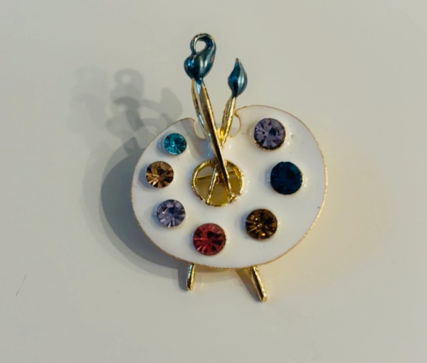 Cute brooch designed as a painter's palette with brushes. It's adorned with colourful, sparkling faux gems. Gold-tone metal finish.