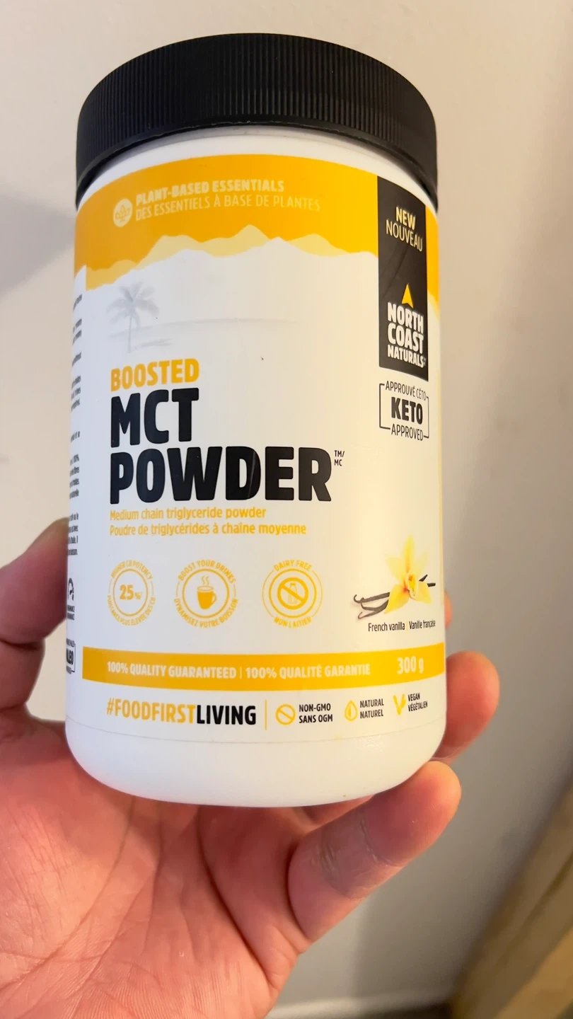 This is North Coast Naturals Boosted MCT Powder in French Vanilla flavour. It's a plant-based powder with 300g of product. It's dairy-free, keto-approved, and non-GMO.
