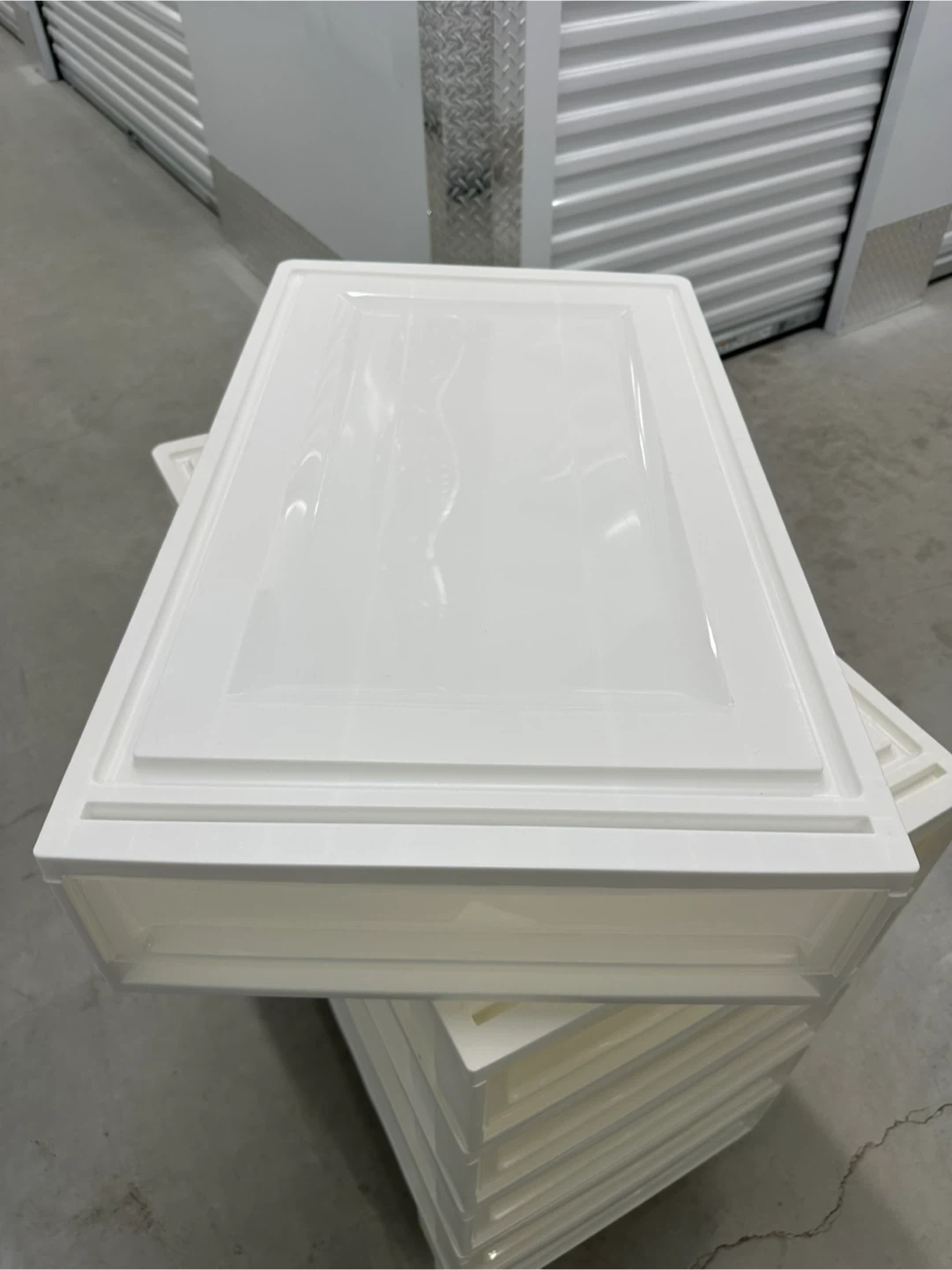 - Stackable white plastic storage drawers