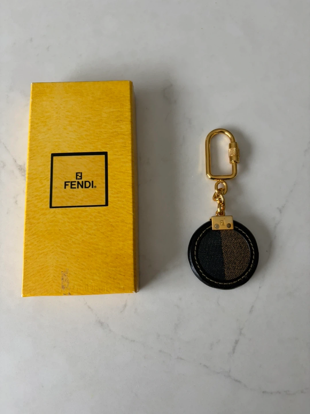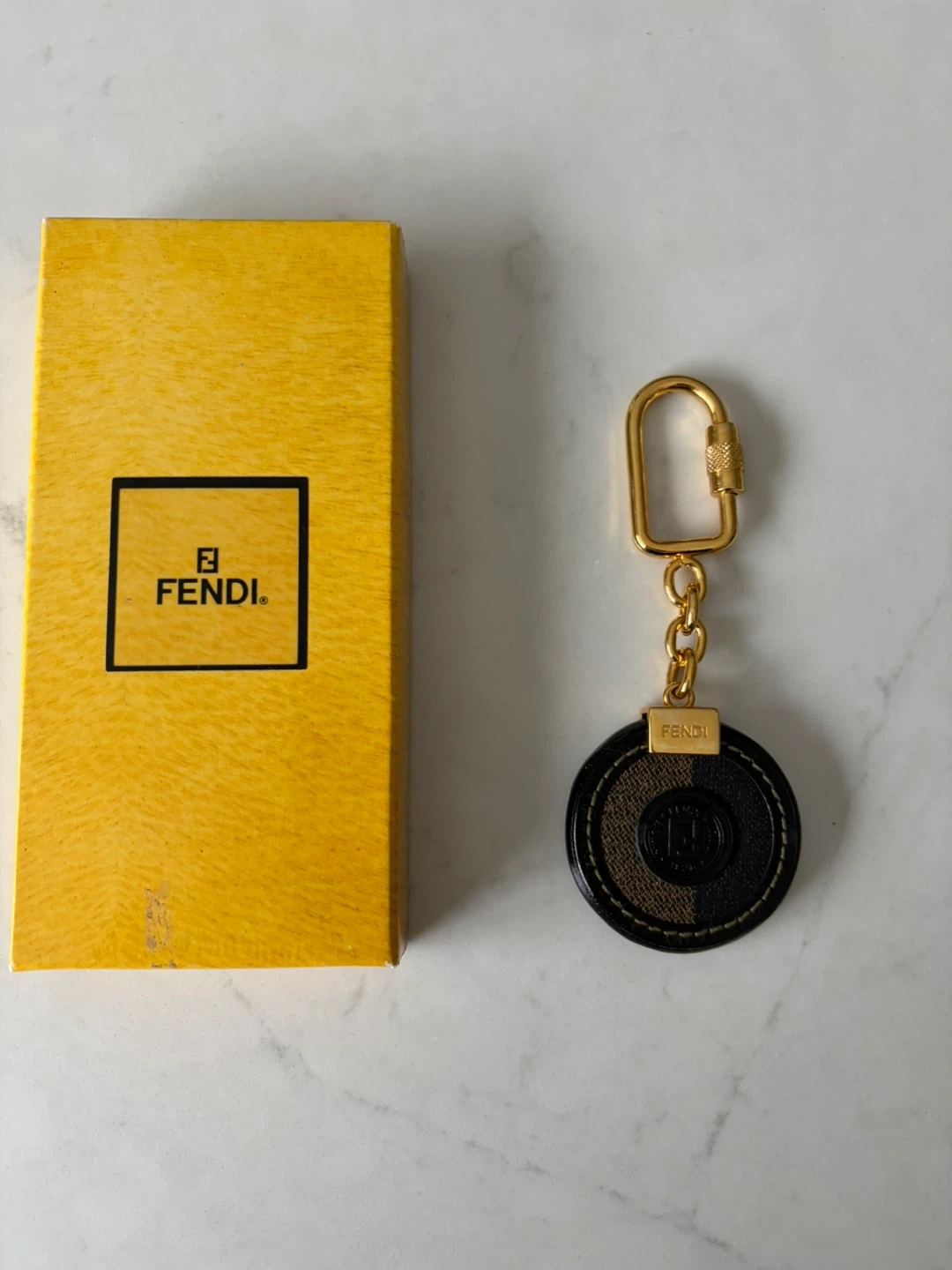 This Fendi keychain features the brand's iconic pattern. It has a gold-tone clasp and chain. Comes with original box.