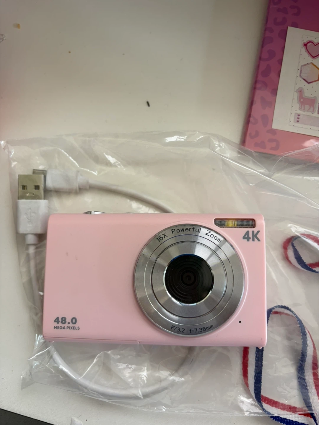 This is a pink digital camera with 48.0 megapixels and 16x powerful zoom. It supports 4K video recording and comes with a USB charging cable. It's great for capturing clear photos and videos!