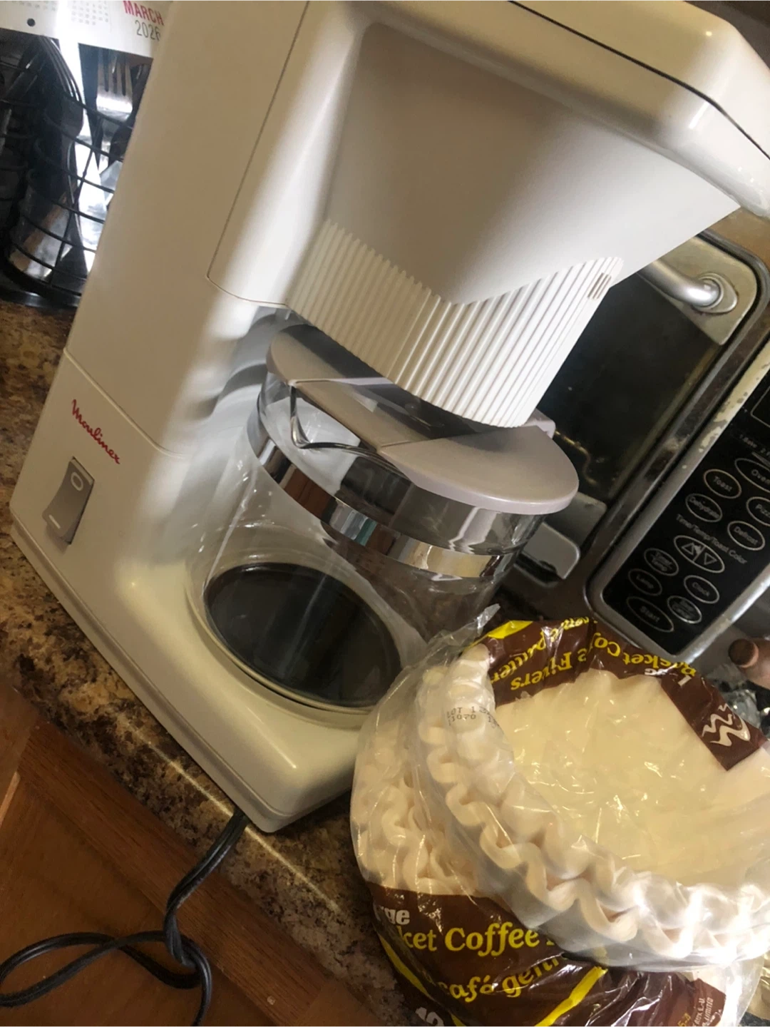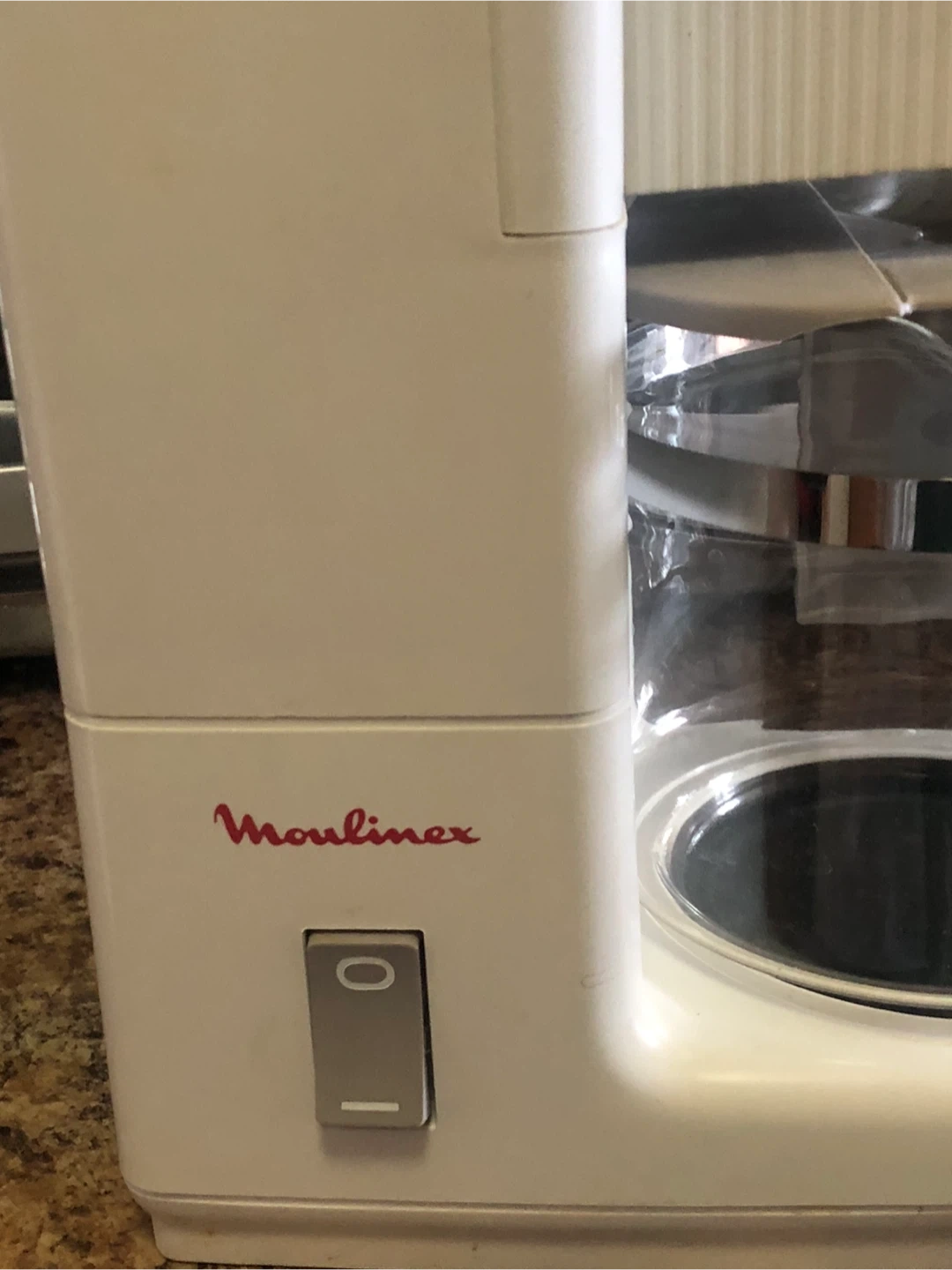 This is a white Moulinex coffee maker. It has a glass carafe and includes a bag of coffee filters. Simple to use with an on/off switch.