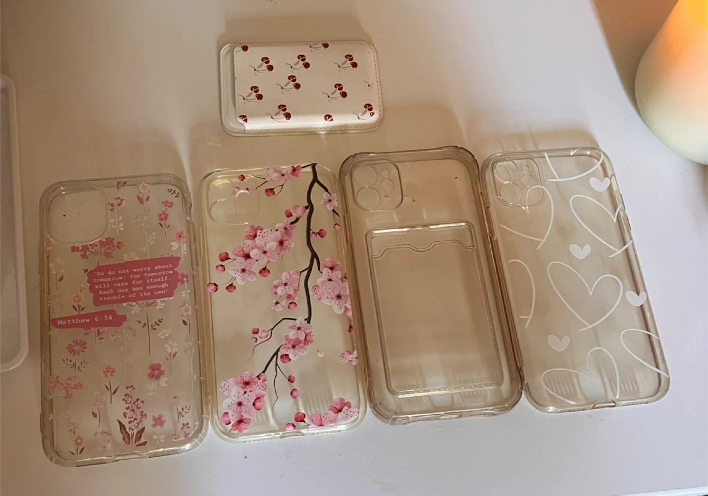 Four clear iPhone 11 cases are included in this lot. Two cases feature decorative designs: one with pink cherry blossoms and another with a floral pattern and scripture from Matthew 6:34. A third case has a simple white heart design, and the fourth is a transparent case with a built-in card holder. These cases offer protection and style for your phone!