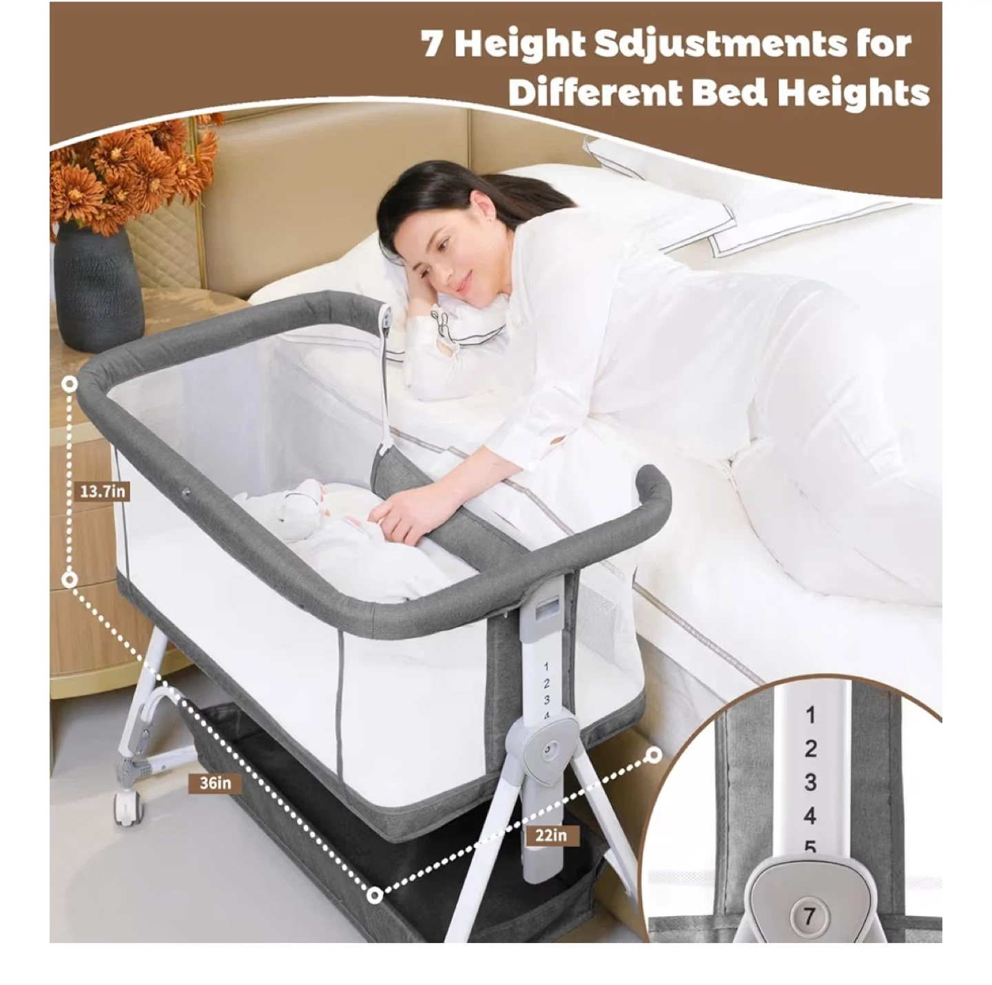 This bedside sleeper features a comfortable mattress with breathable mesh design. It has 7 height adjustments for different bed heights and can also function as a rocking bassinet by flipping the wheels up. The mattress is 33x19 inches and the unit has a convenient storage basket underneath. It's great for keeping your baby close and safe at night!
