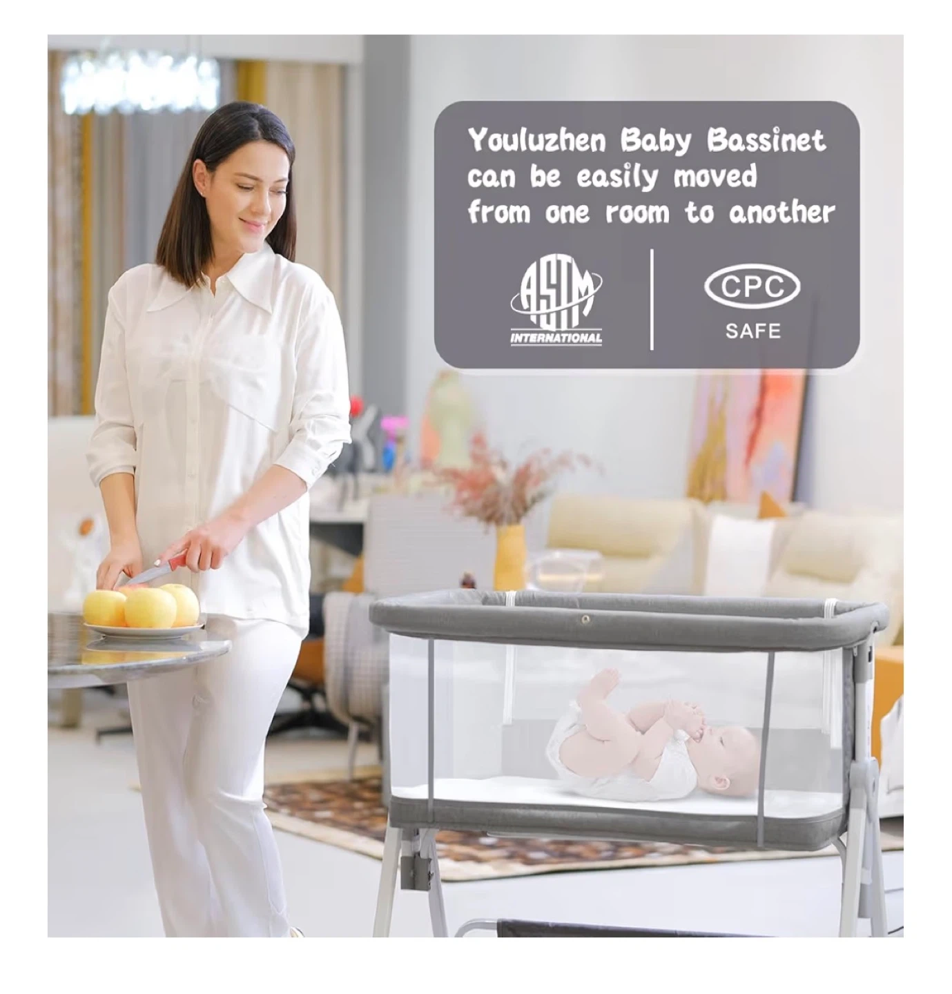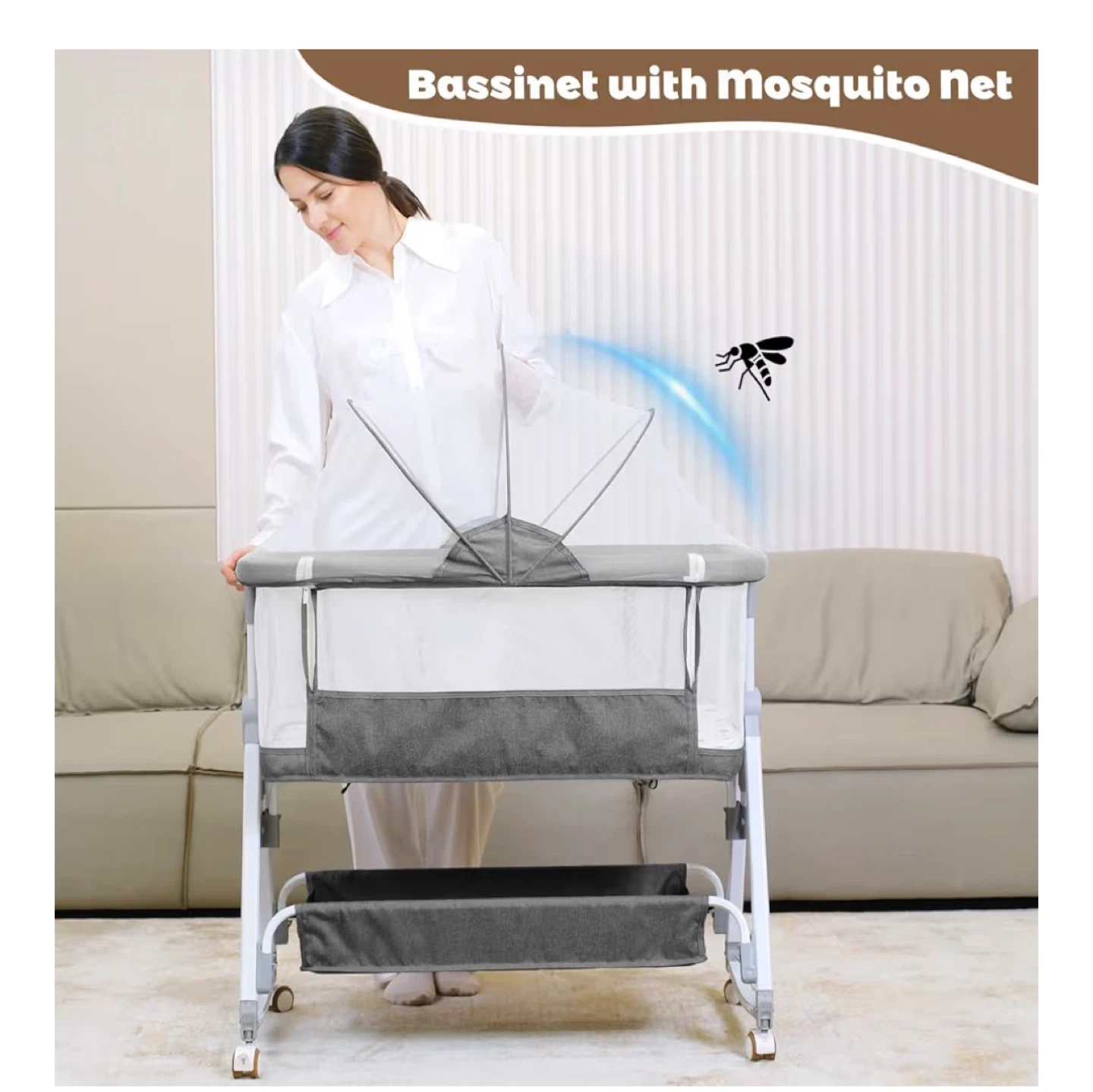 Grey Bassinet & Bedside Sleeper with Mosquito Net