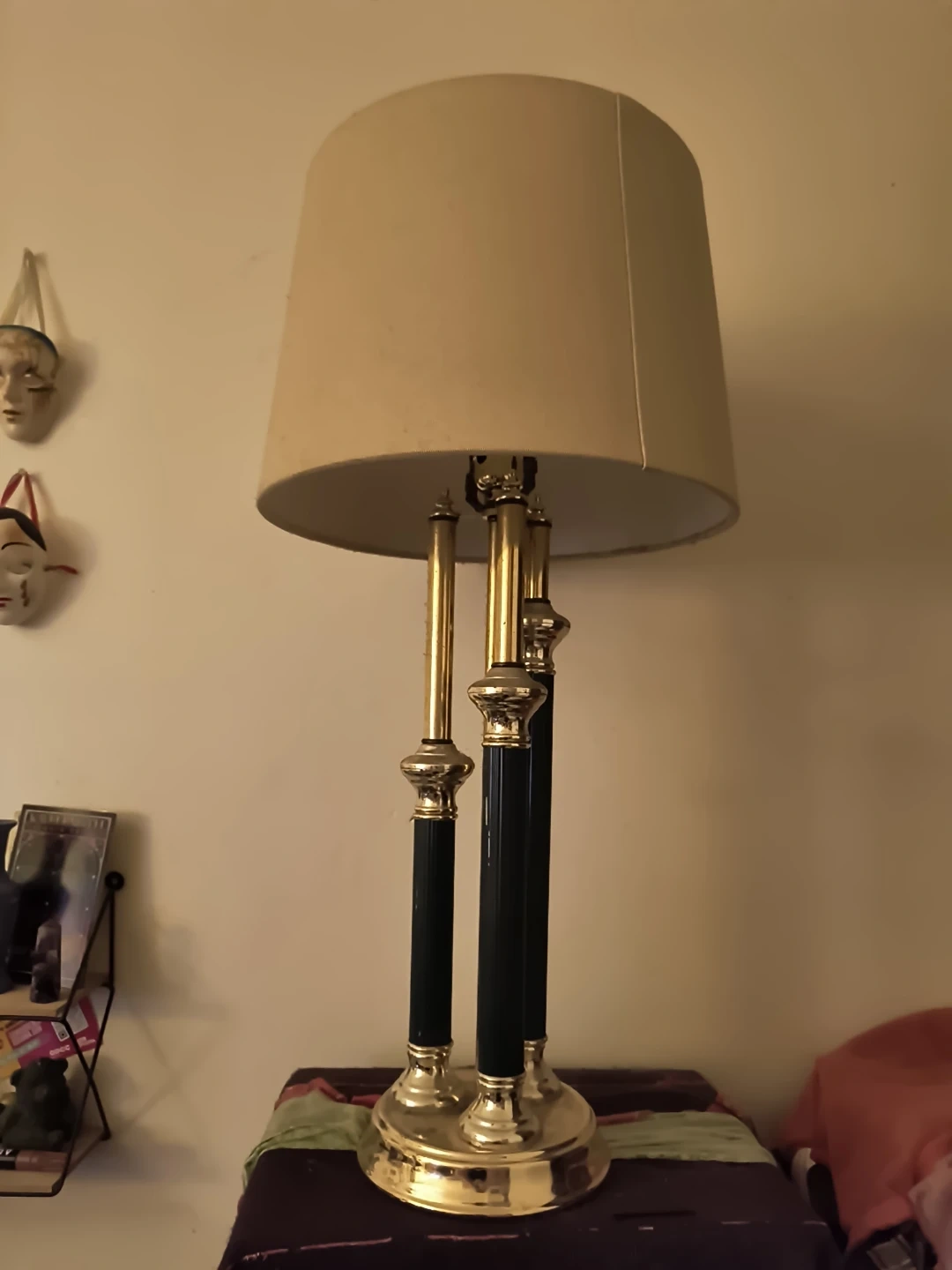 This is a stylish table lamp featuring a neutral beige fabric shade. The base has a decorative design with gold-tone accents and ribbed black sections. It's a classic addition to any room's lighting. It would be useful for adding ambient light to a living room or bedroom. Missing turn knob