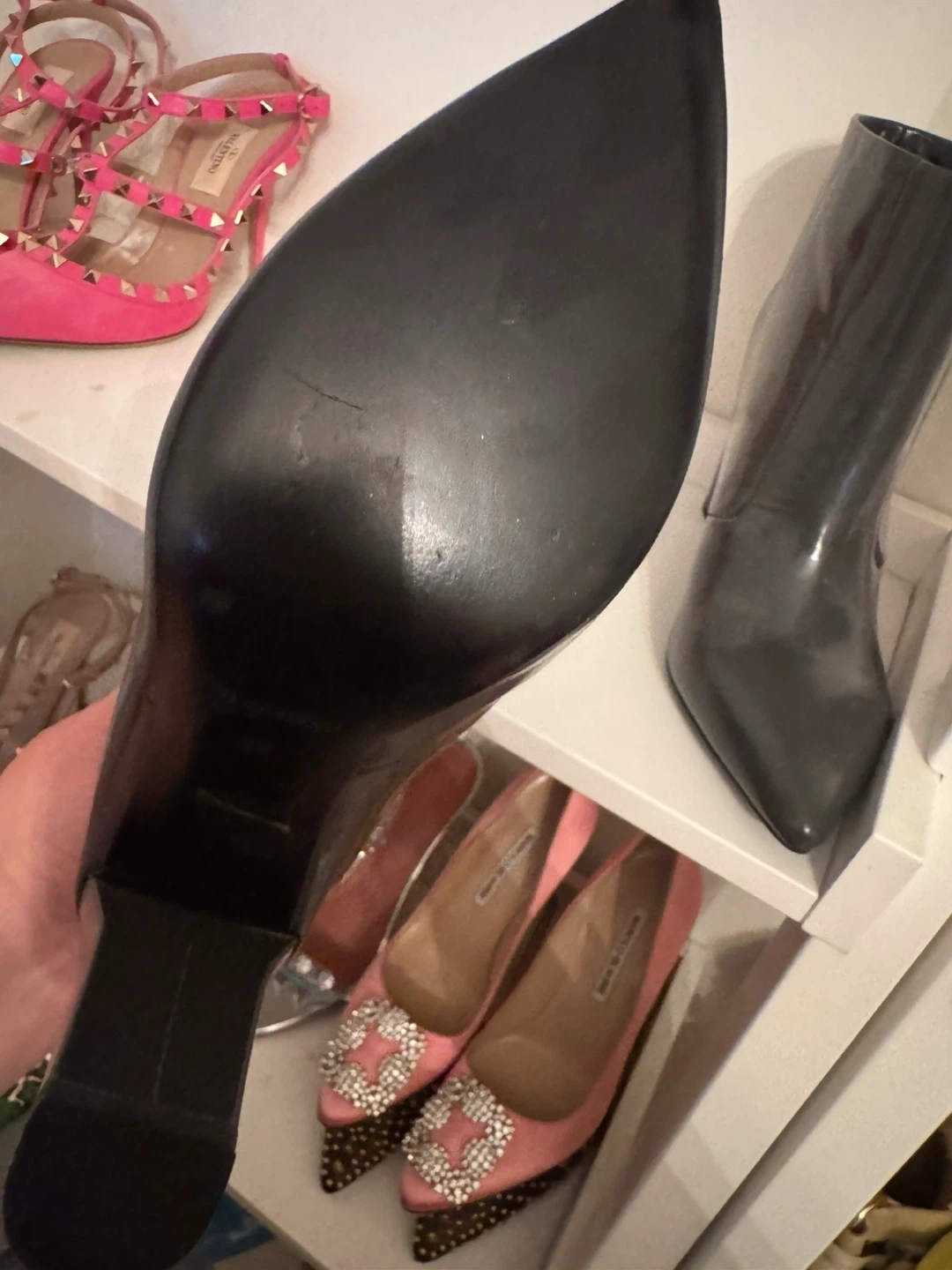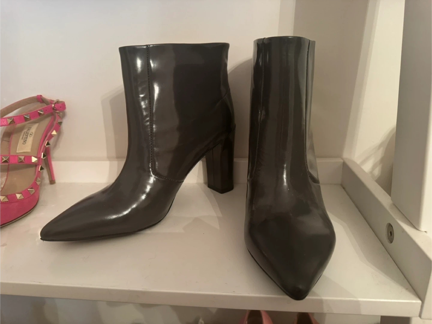 Shiny dark grey Jil Sander Navy ankle boots. Pointed toe with a block heel. Includes original box. Size 38. retailed over $1200