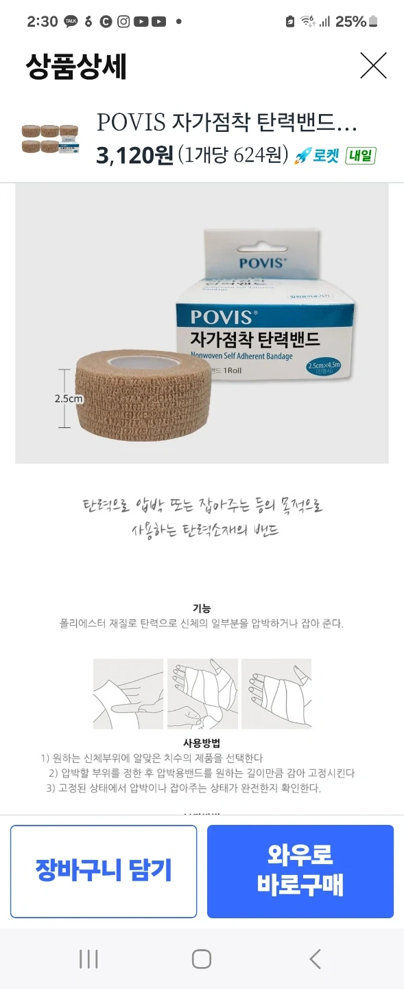 This is a POVIS nonwoven self-adherent elastic bandage. It's made of polyester material to compress or hold parts of the body. The dimensions are 2.5cm by 4.5m.