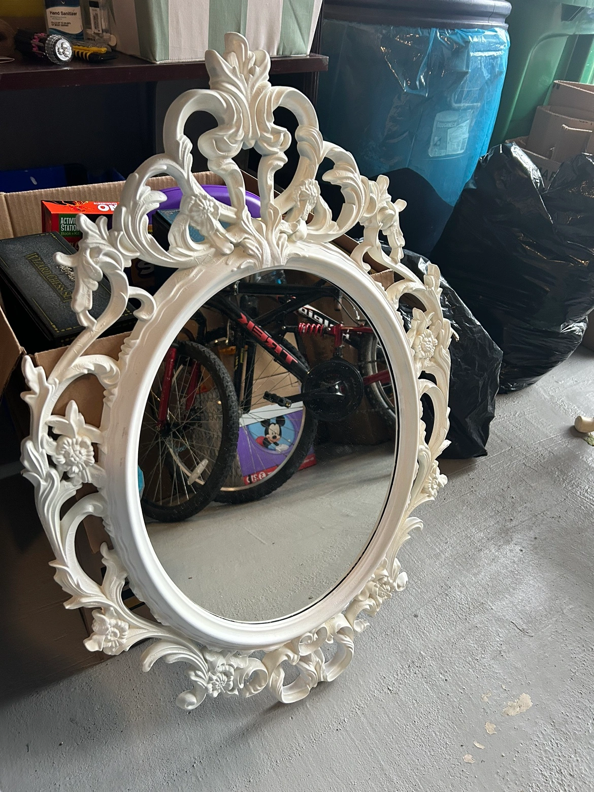 Large white oval mirror with an ornate frame. The frame is quite detailed, featuring many flowers and scrolls. The mirror is in good condition. Was painted white so has an aged look.