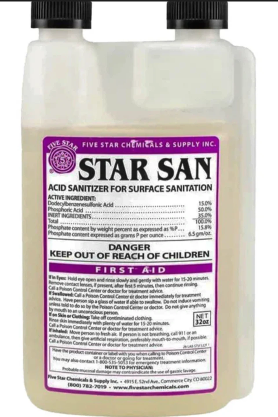 Selling a 32 oz bottle of Five Star Star San Sanitizer. It's an acid sanitizer perfect for surface sanitation. Used in home brewing for wine, beer and other fermented beverages.