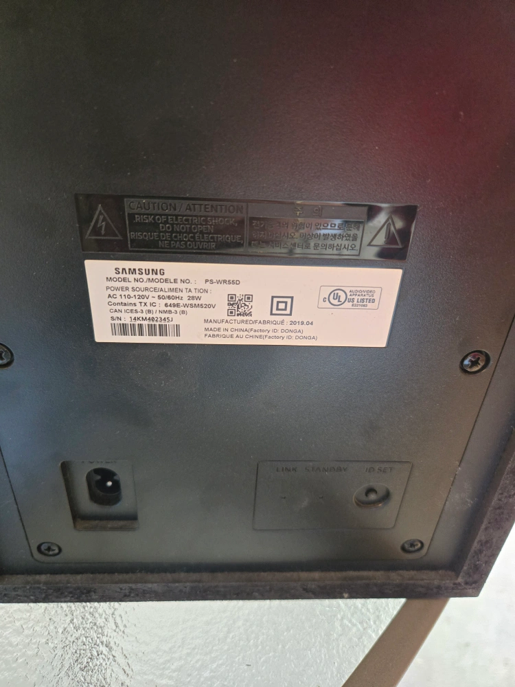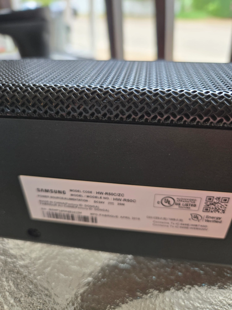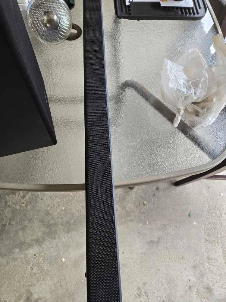 A sleek black sound bar. Features a black mesh cover. Would be great for enhancing your movie nights. Has various ports for easy connection.