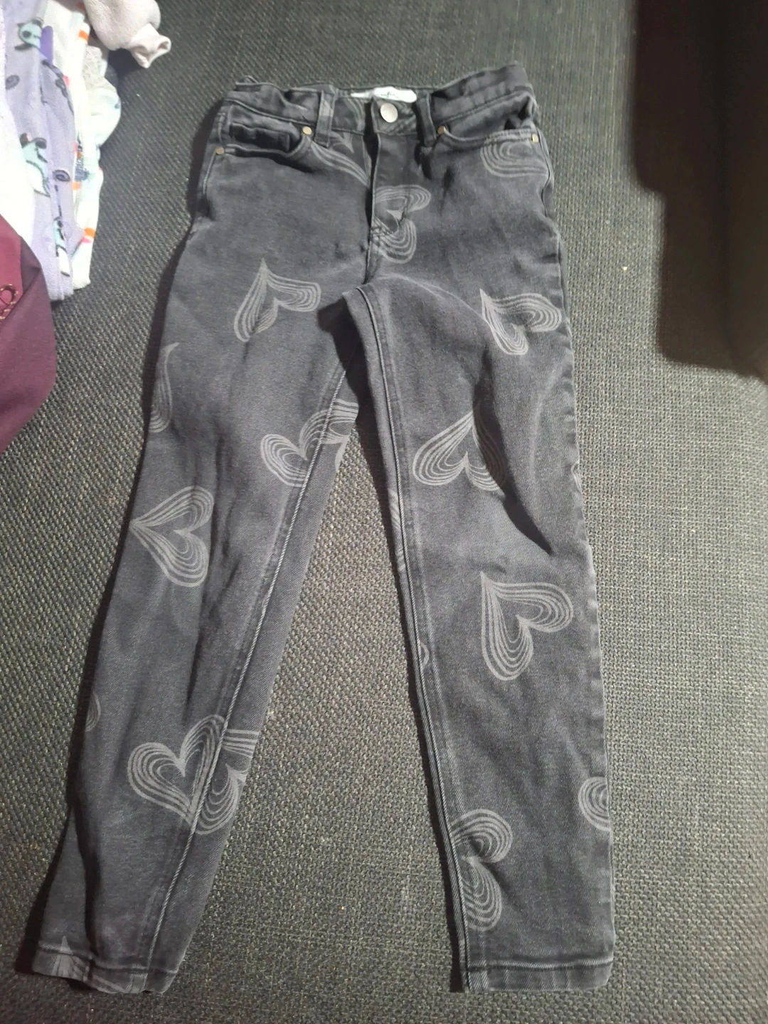 Grey denim jeans for girls with a repeating heart pattern. These jeans feature a button and zip closure. A comfy and stylish addition to any kid's wardrobe! Size 7
