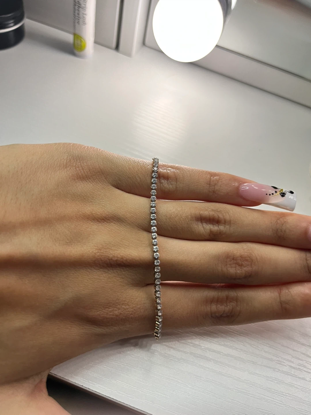 Classic pandora tennis bracelet with an adjustable slider clasp. Features a delicate chain adorned with sparkling stones. It's a versatile piece for everyday wear or special occasions!