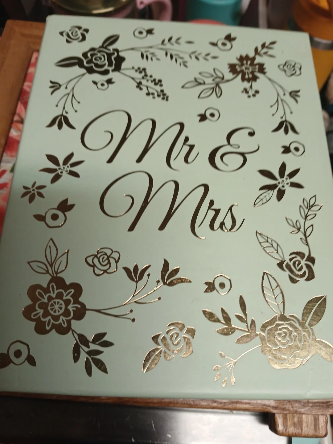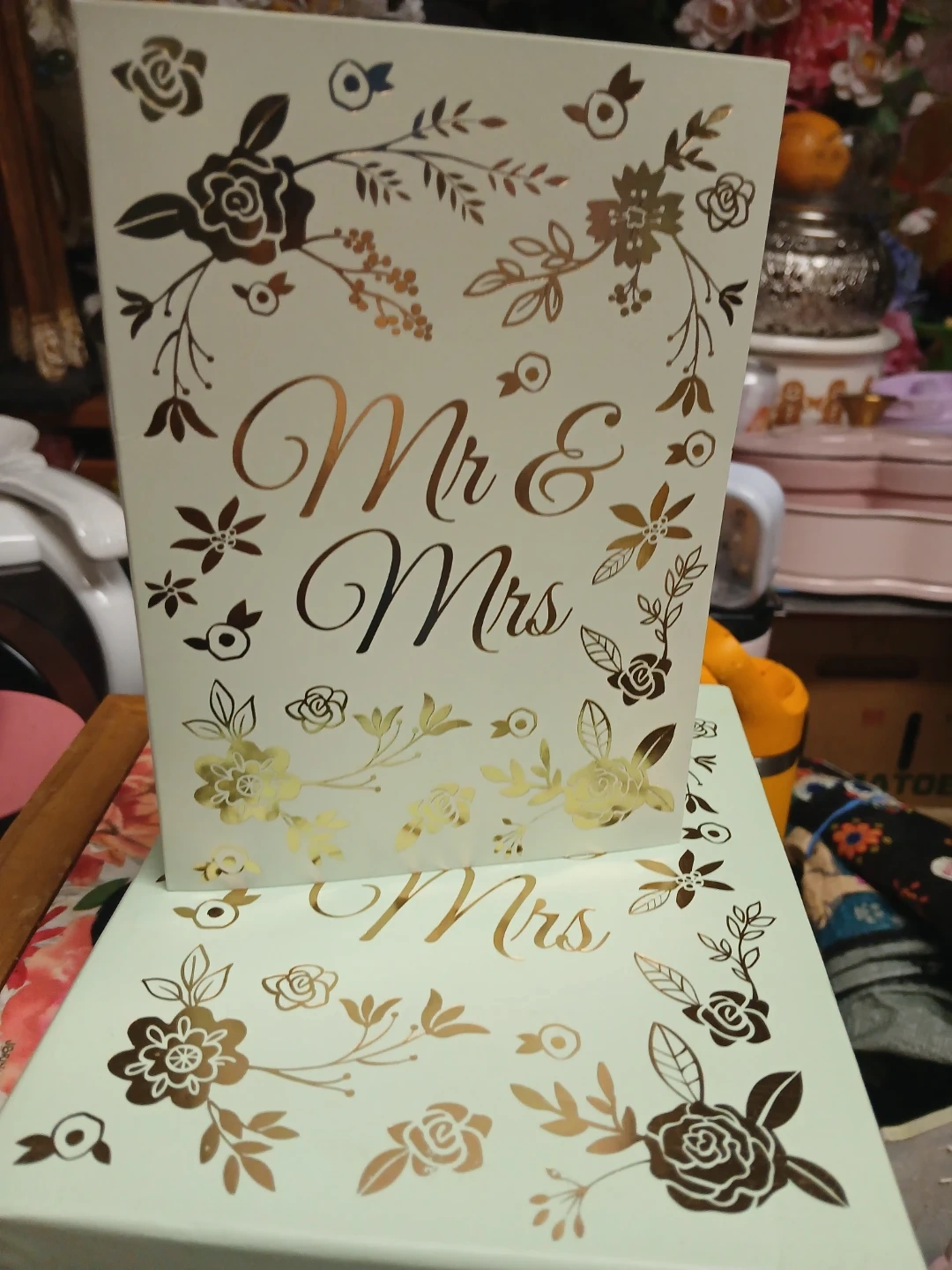 box set of 20 cards, 5 each in these colours: pink, green, white, gray with a "Mr & Mrs" theme. They feature a floral design with gold accents. Perfect for wedding invitation or than you for gifts.