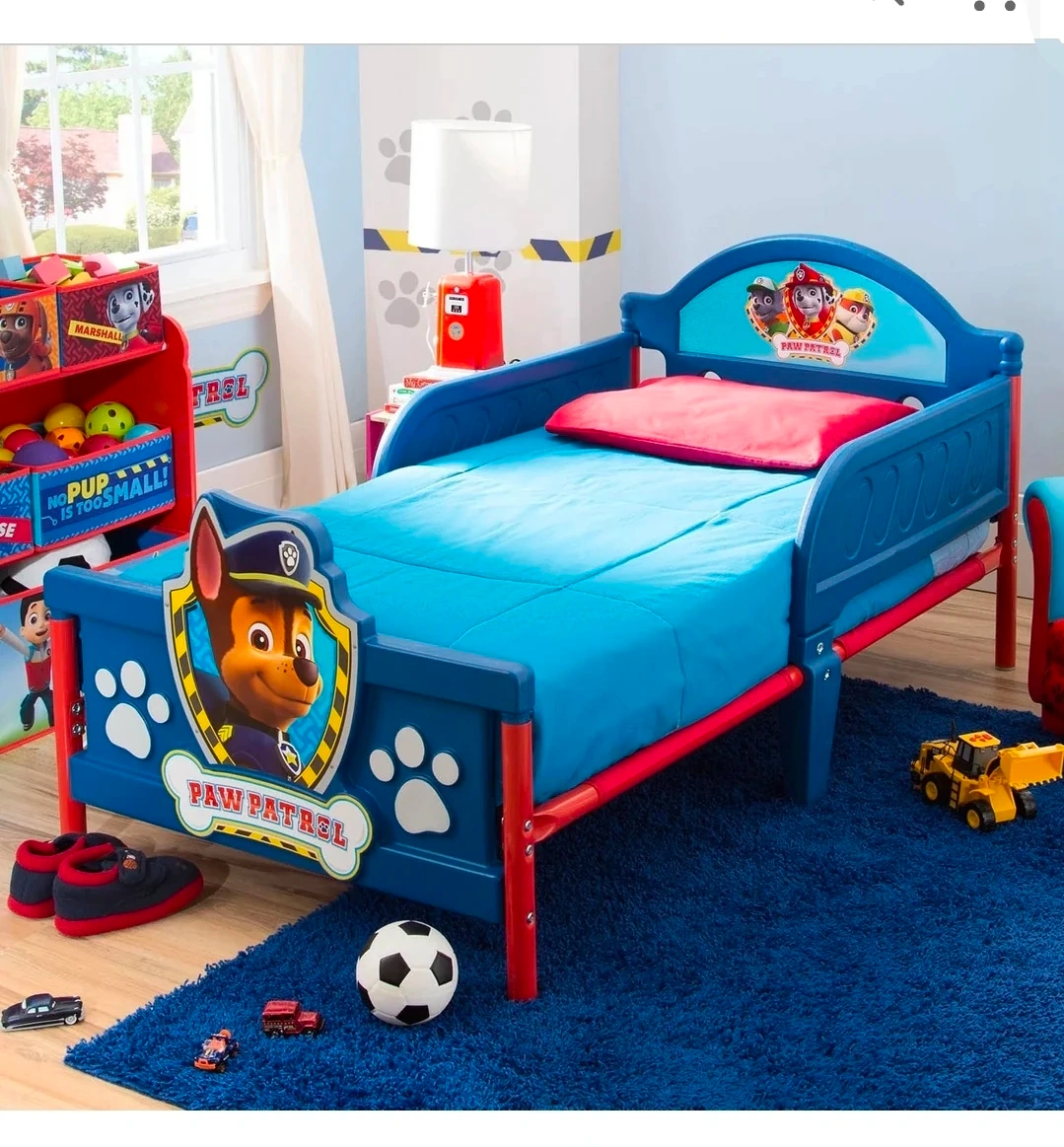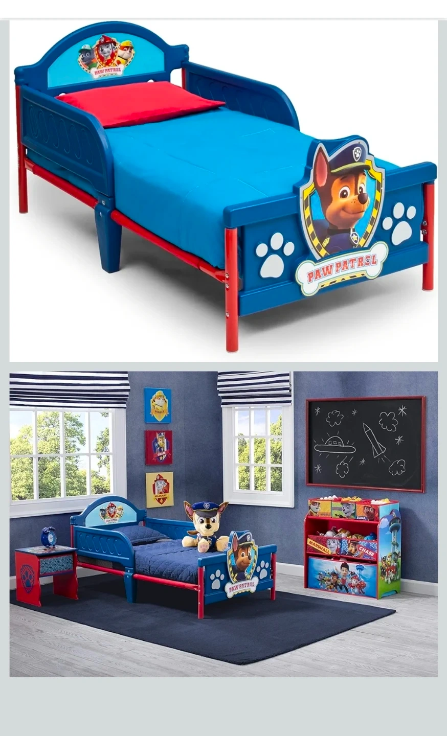 This Paw Patrol toddler bed is made from plastic with sturdy guardrails. It features Chase on the headboard and footboard. It's perfect for little ones transitioning to a bigger bed.