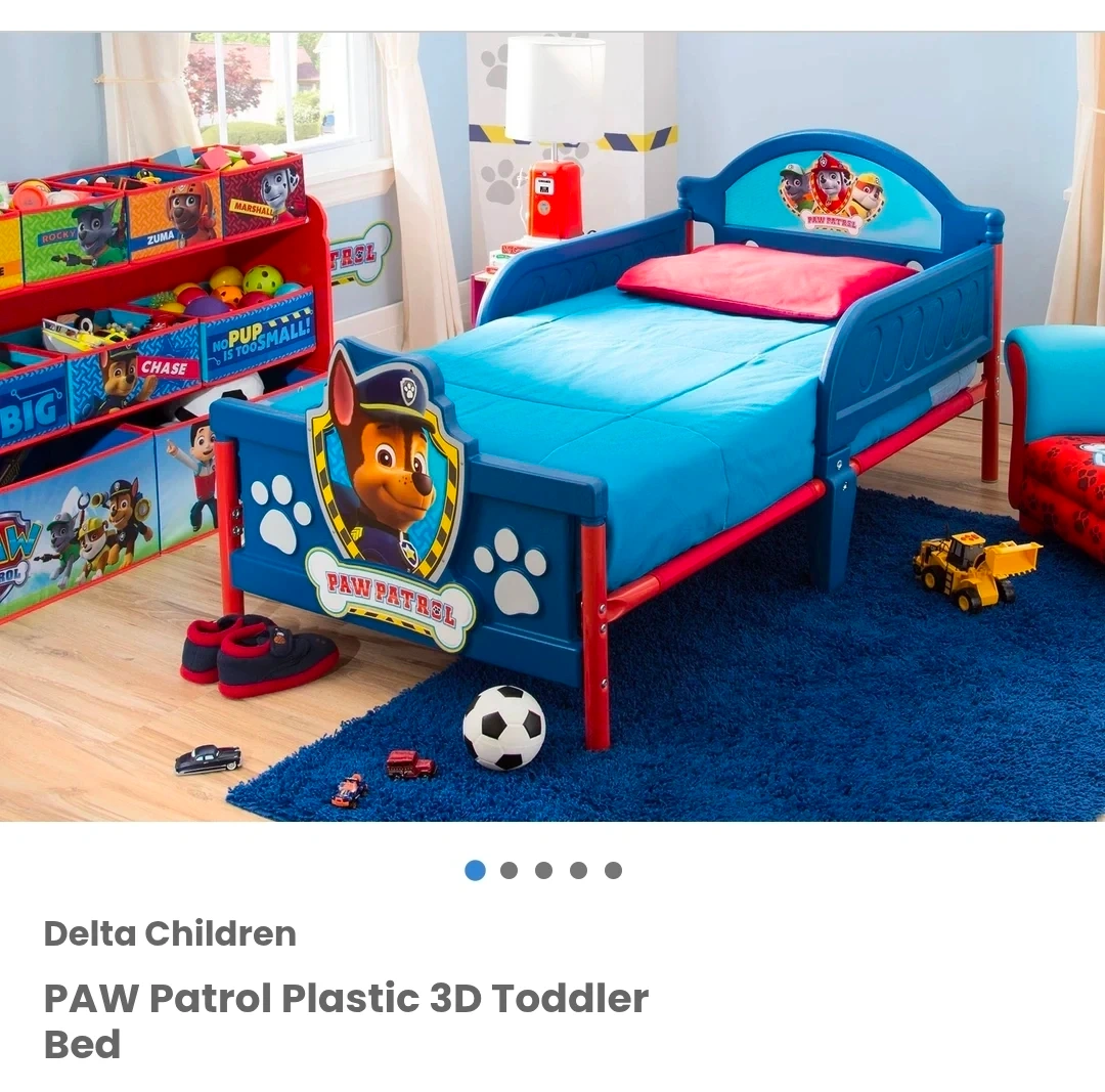 This Paw Patrol toddler bed is made from plastic with sturdy guardrails. It features Chase on the headboard and footboard. It's perfect for little ones transitioning to a bigger bed.