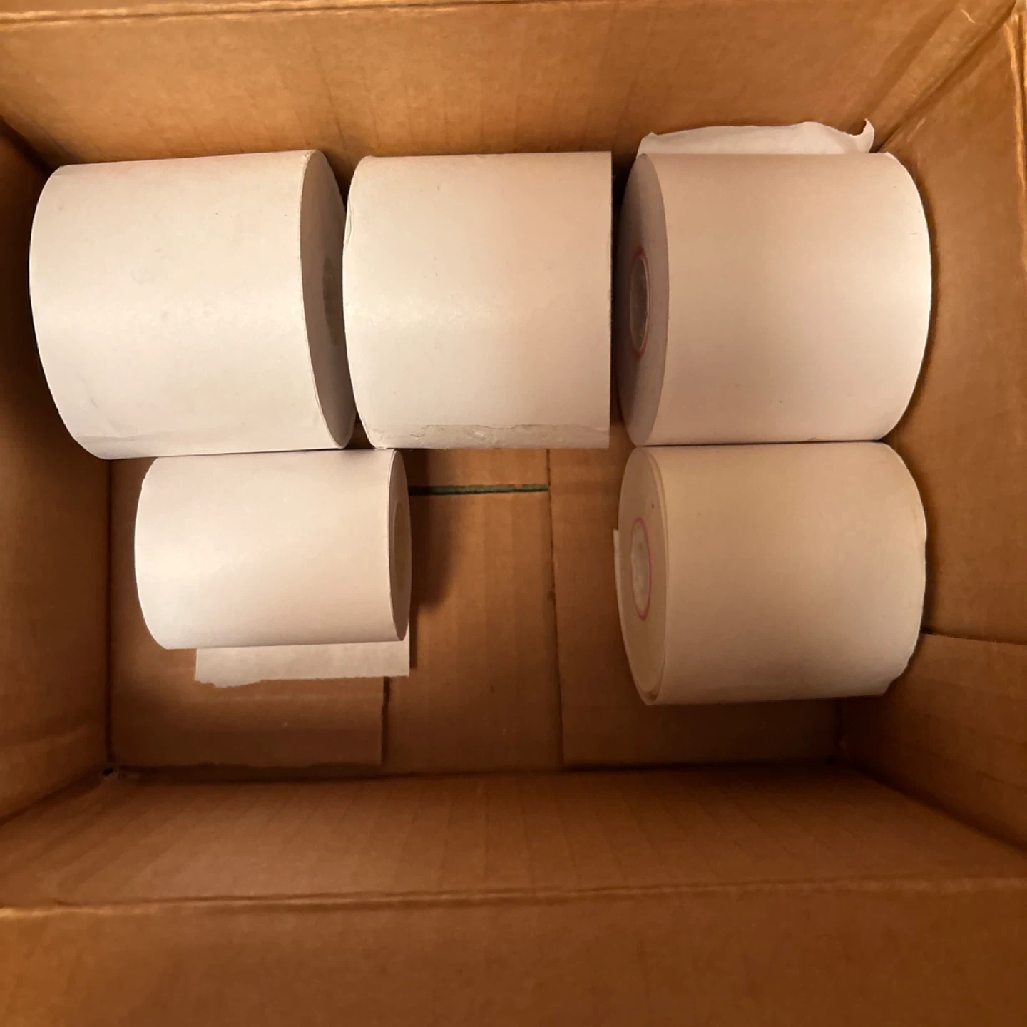 Pack of five thermal paper rolls. These are standard receipt rolls. They're great for cash registers or credit card machines! Various sized rolls. Left from office closure.