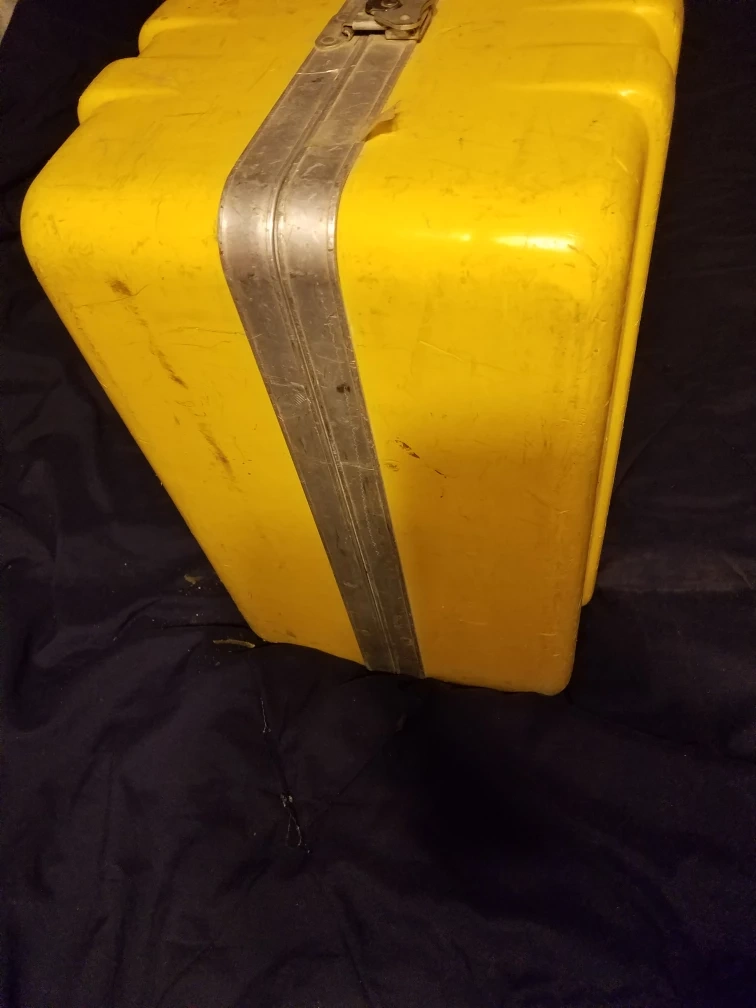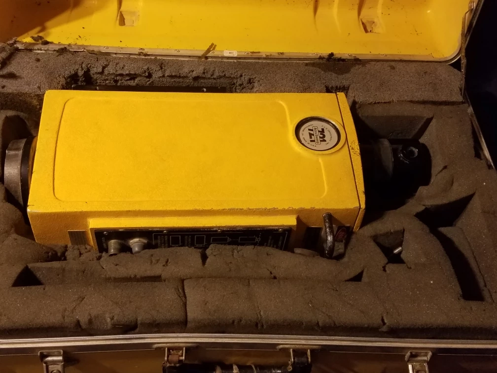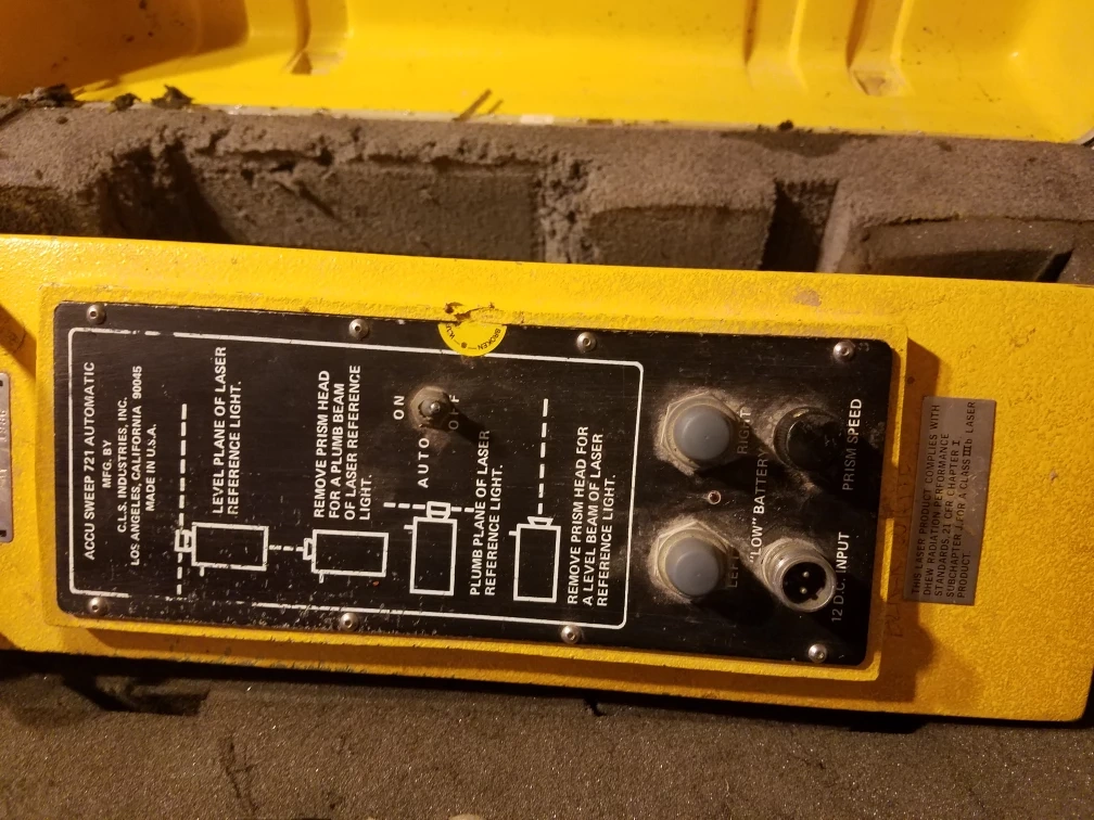 This is a C.L.S. Industries Accu Sweep 721 Automatic Level. It comes in a yellow carrying case with foam inserts for protection. The unit is yellow and appears to be made of metal.