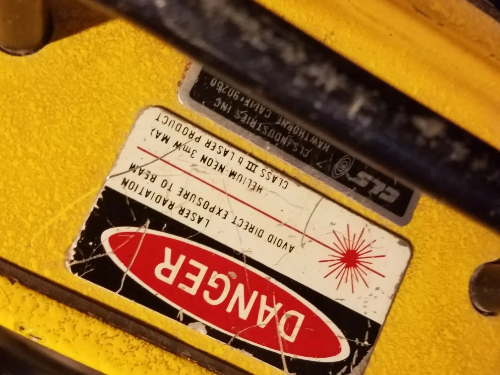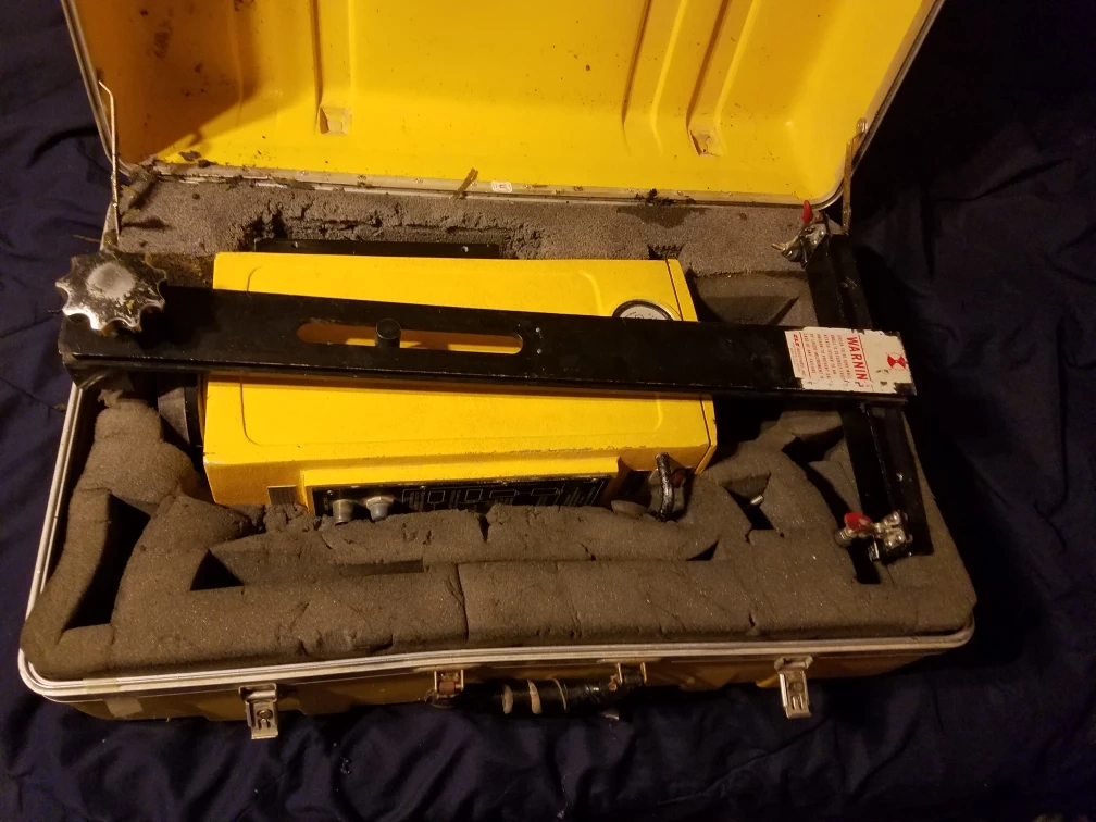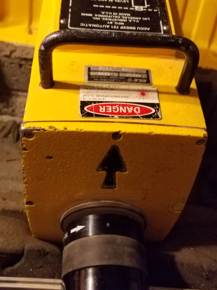 This is a C.L.S. Industries Accu Sweep 721 Automatic Level. It comes in a yellow carrying case with foam inserts for protection. The unit is yellow and appears to be made of metal.