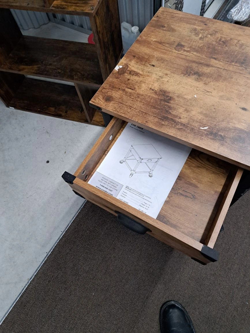 This industrial-style end table is a great addition to any room. It features a drawer for storage and wheels for easy movement. The wood and metal construction gives it a sturdy and stylish look. Perfect as a nightstand or side table! Has a little scratch on the surface.