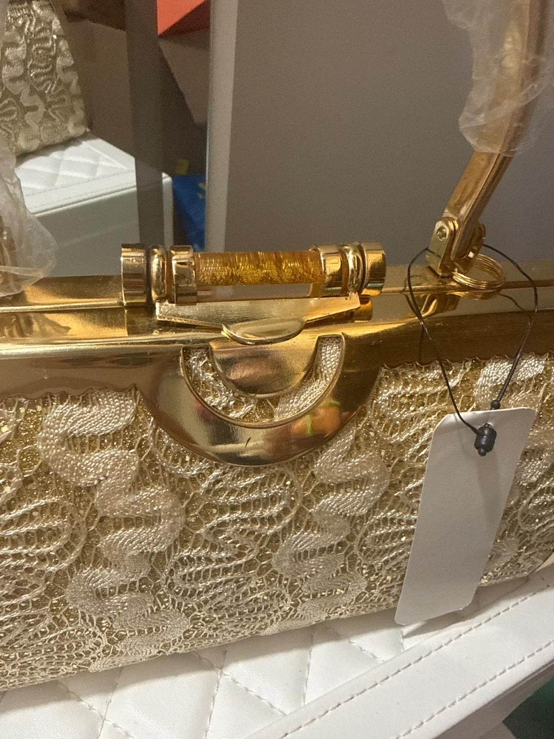 This gold clutch features a beautiful lace overlay and ornate embossed detailing on the sides. It has a secure clasp closure and a sturdy top handle, plus a detachable chain. It's perfect for formal events or a night out!