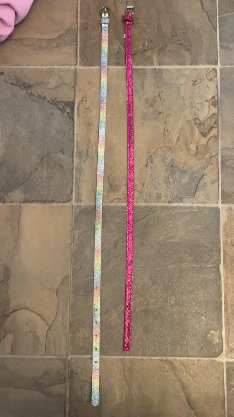 Two glittery belts to add a little sparkle to your day! One is a rainbow glitter and the other is pink glitter. Kids medium,pick up only😁