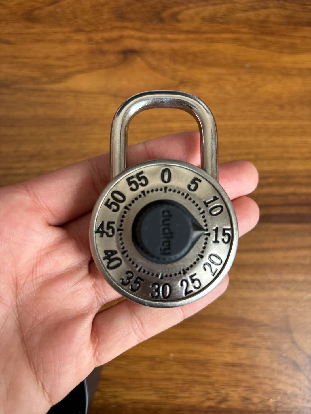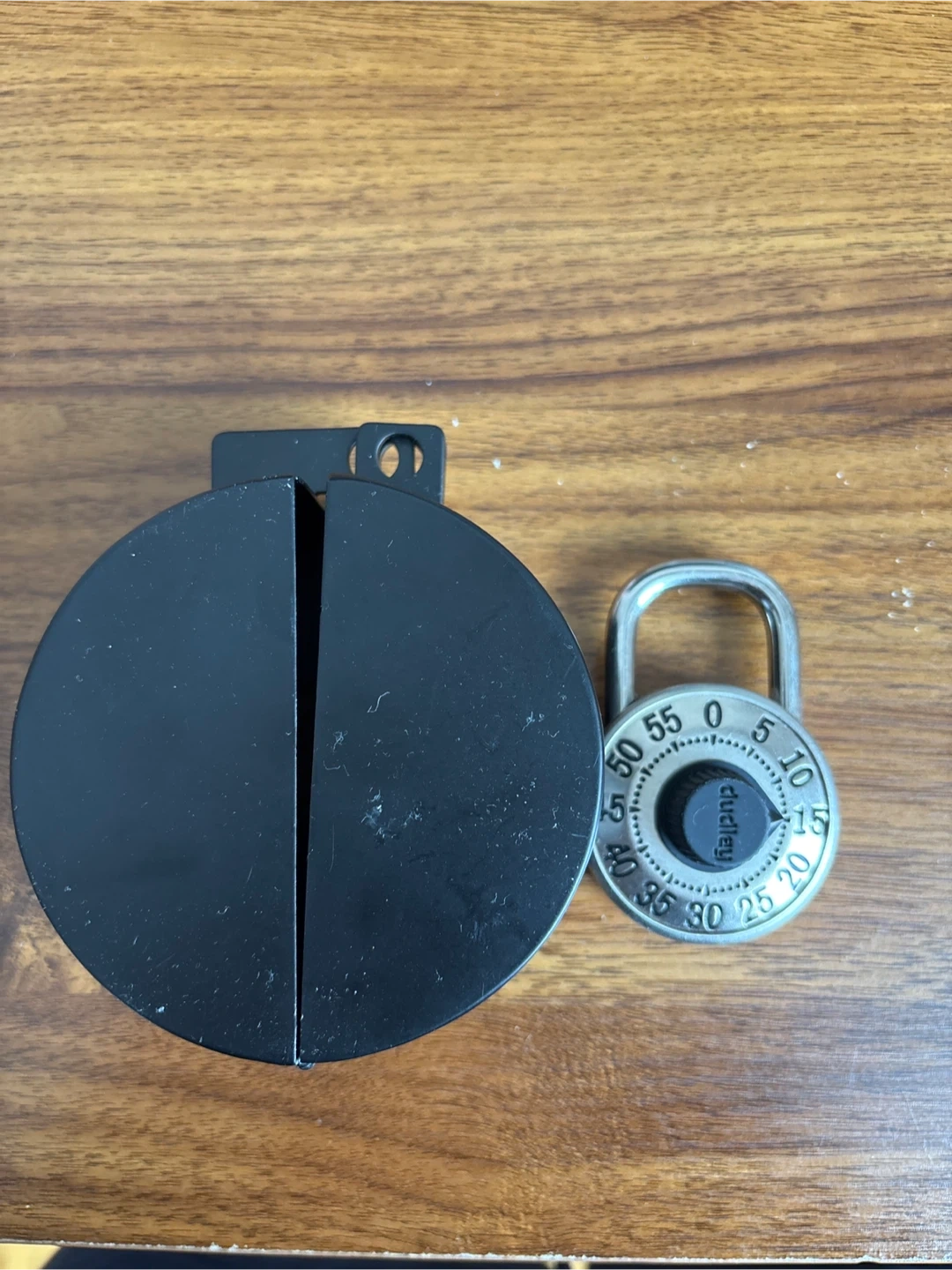 This is a Dudley combination lock with a silver-tone metal body. It features a resettable 3-dial combination. Also included is a black circular lock cover or disc.