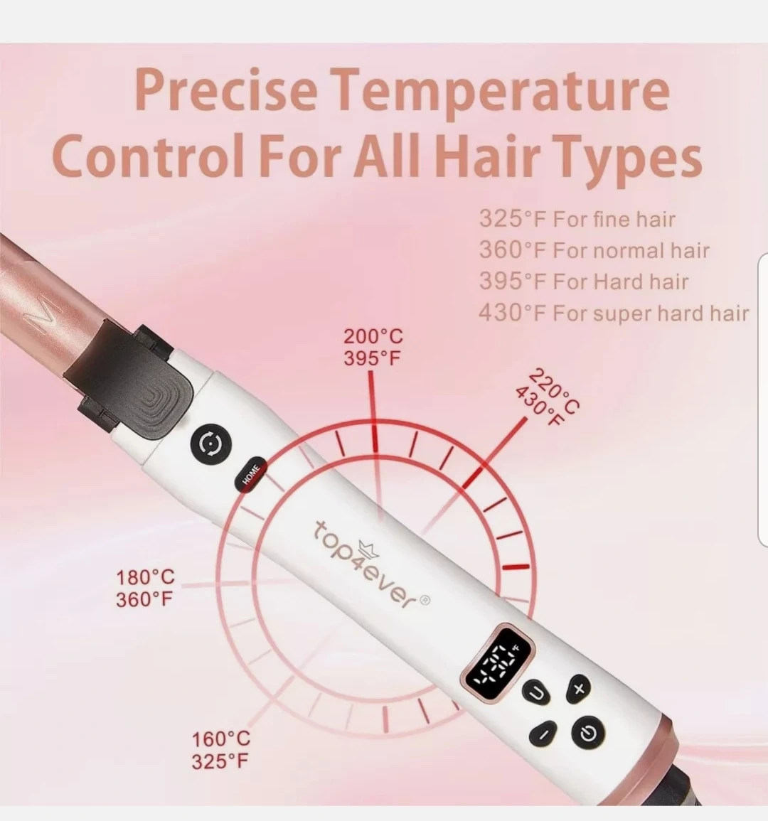 Precise Temperature Control for All Hair Types: The hair curler's LCD screen displays 12 adjustable temperature settings ranging from 325°F to 430°F, providing precise control and accommodating all hair types, including long hair and hair that's hard to style.
