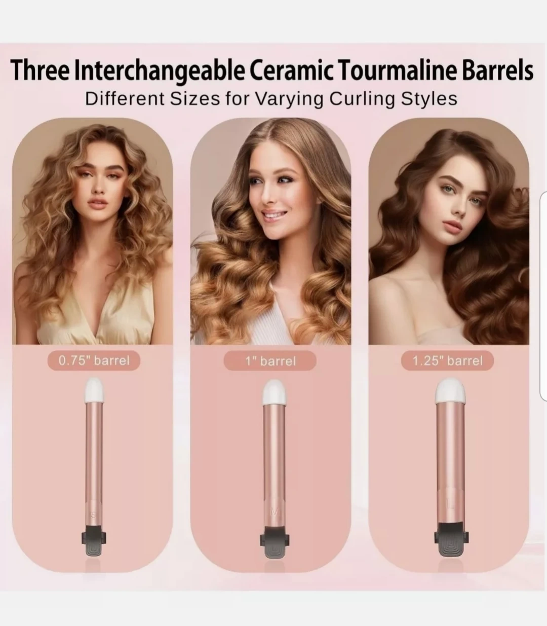 Automatic Curling Iron with Interchangeable Barrels: Easily create perfect hairstyles with our curling wand set featuring bi-directional auto-rotating function and 3 interchangeable ceramic tourmaline barrels (0.75", 1", 1.25"), simplifying barrel switching and catering to various curling needs.