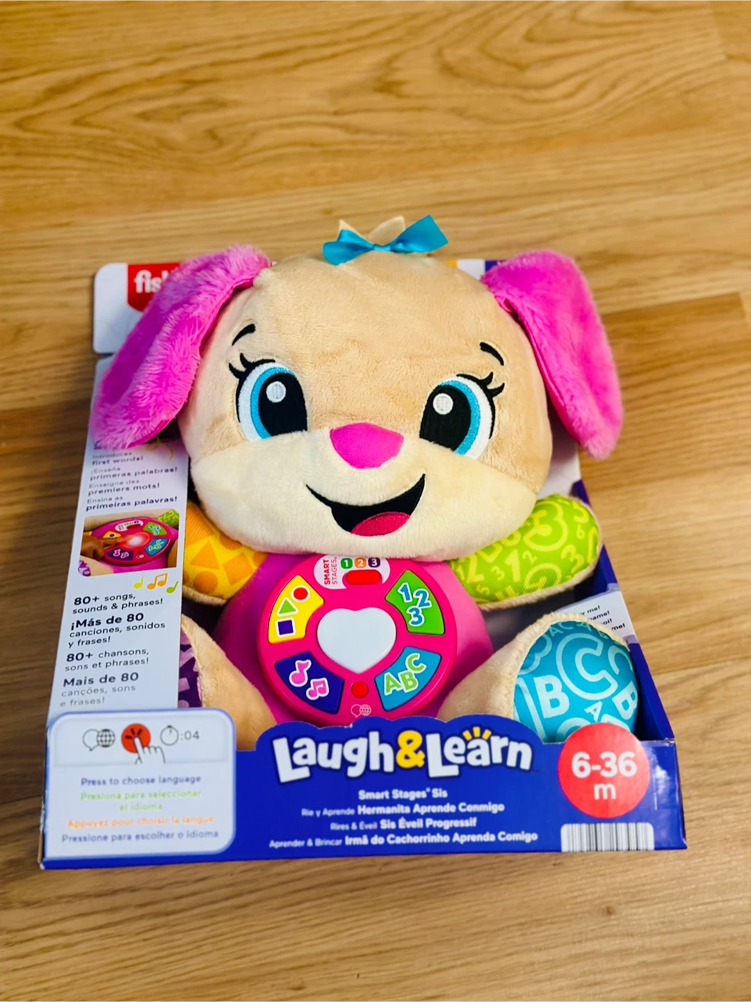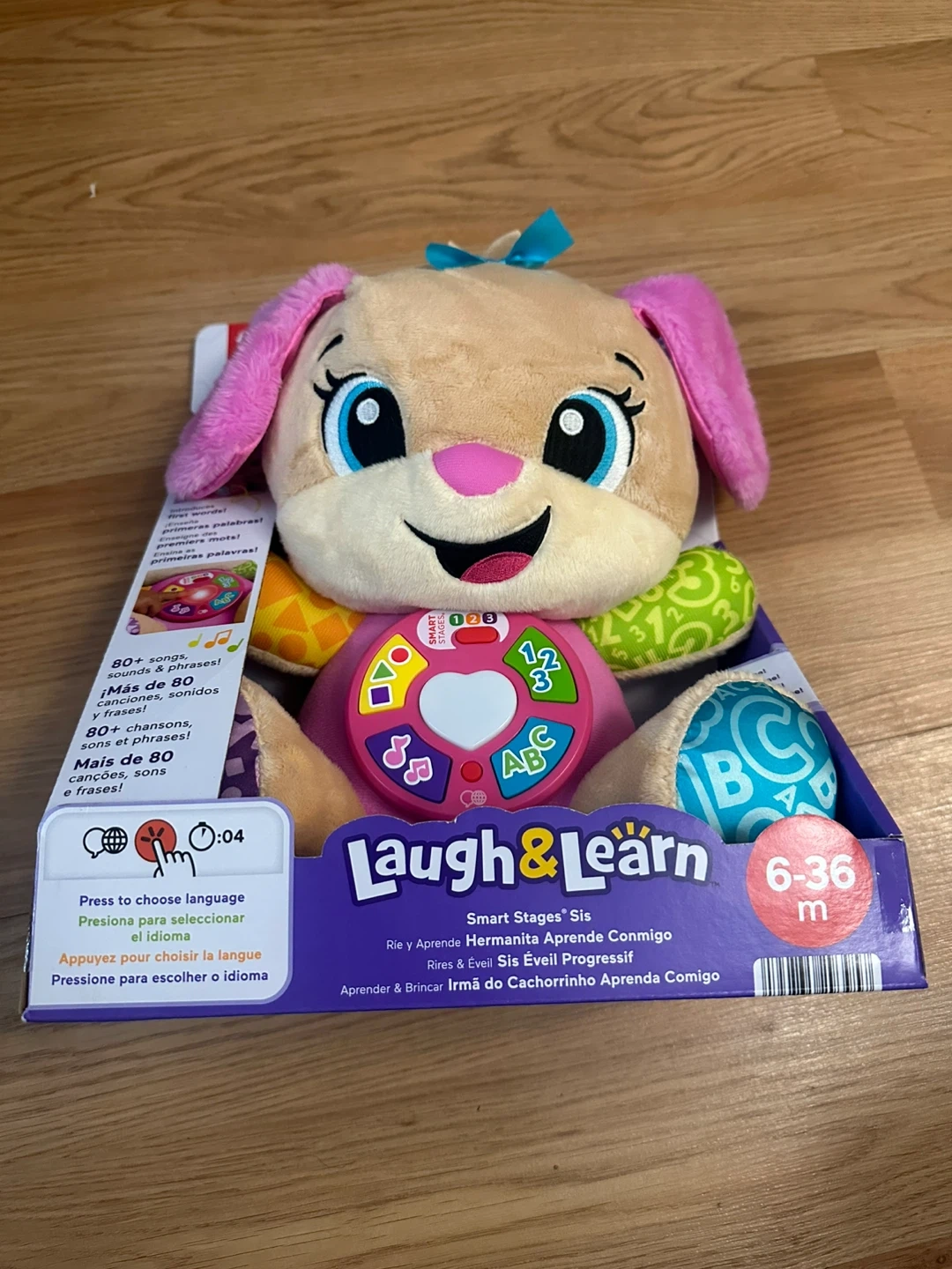 This is a Fisher-Price Laugh & Learn Smart Stages Sis plush toy! It's designed for little ones aged 6-36 months. It has over 80 songs, sounds, and phrases to help your little one learn and grow. It requires 3 AA batteries. Comes with the original box! Pickup or extra for delivery.