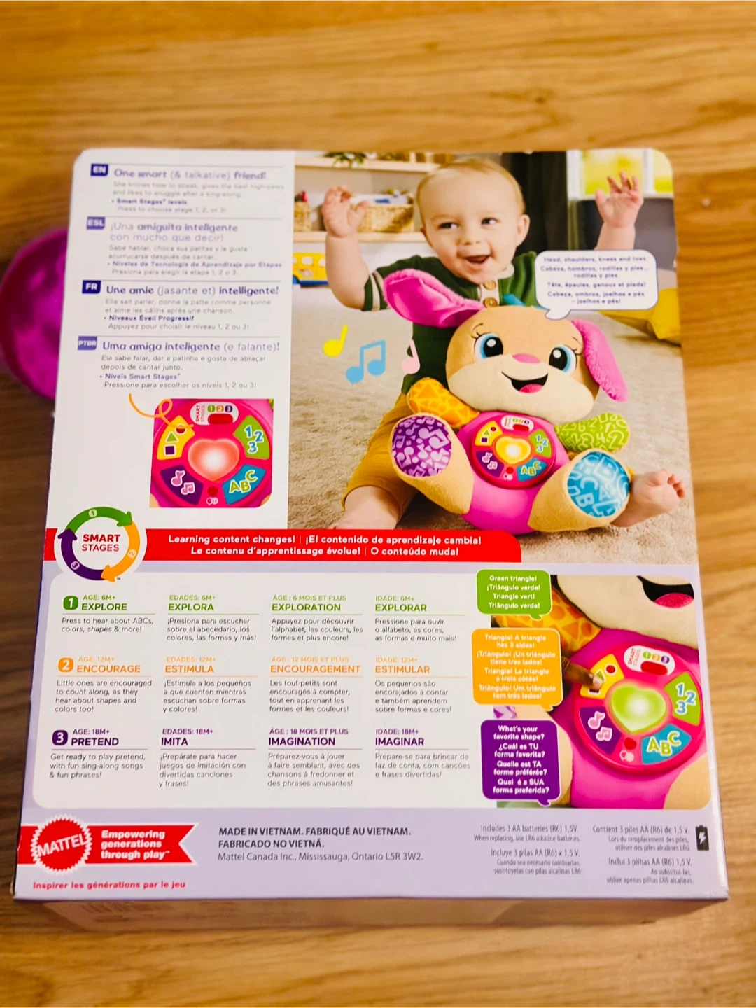 This is a Fisher-Price Laugh & Learn Smart Stages Sis plush toy! It's designed for little ones aged 6-36 months. It has over 80 songs, sounds, and phrases to help your little one learn and grow. It requires 3 AA batteries. Comes with the original box! Pickup or extra for delivery.