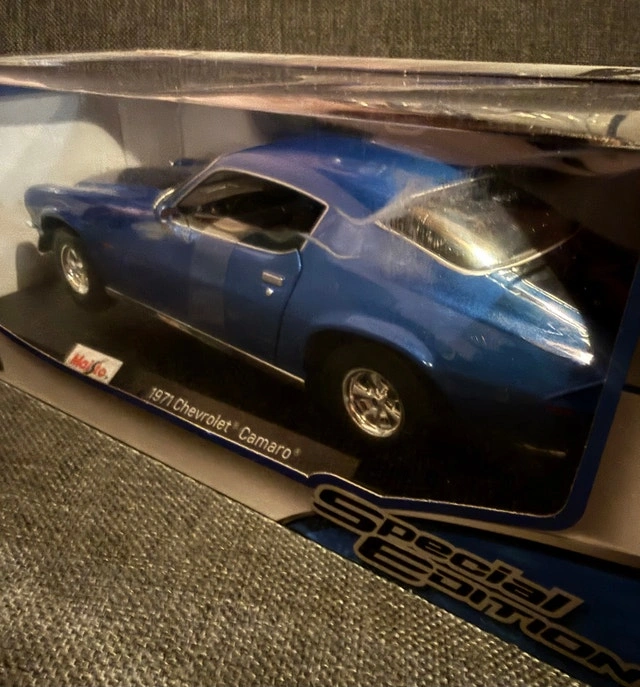 This Maisto 1:18 scale 1971 Chevrolet Camaro Special Edition diecast model is in new condition, showcasing a blue exterior with intricate detailing. A great addition to any car collection. Brand: Maisto, Scale: 1:18, Model: 1971 Chevrolet Camaro Special Edition, Condition: New in box, Colour: Blue.