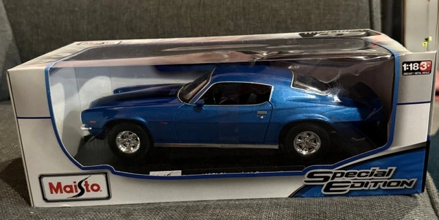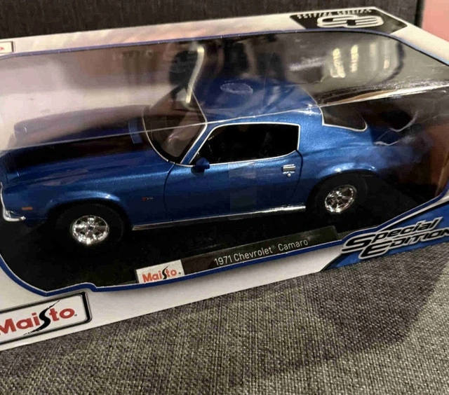 This Maisto 1:18 scale 1971 Chevrolet Camaro Special Edition diecast model is in new condition, showcasing a blue exterior with intricate detailing. A great addition to any car collection. Brand: Maisto, Scale: 1:18, Model: 1971 Chevrolet Camaro Special Edition, Condition: New in box, Colour: Blue.