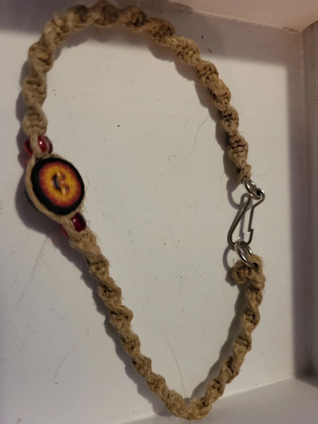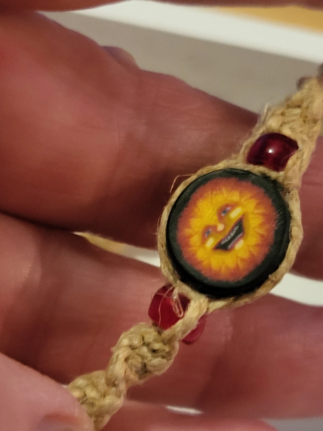 This unique bracelet is crafted from braided hemp cord and features a colourful circular charm with a smiling sun design. It's adorned with small red beads. The bracelet fastens with a metal clasp for easy wear.