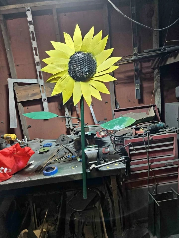 Add a bold, unique statement to your garden or patio with this one-of-a-kind handcrafted metal sunflower. Standing at a striking height, this piece is built to last and designed to catch the eye. Key Features: Eco-Friendly: Expertly crafted from 100% recycled/reclaimed metal materials, including a heavy-duty mesh center and industrial-grade steel petals. Artisan Quality: Hand-welded with a rugged, textured finish that celebrates its industrial roots. Weather Resistant: Painted in a vibrant sunflower yellow and deep forest green to brighten up your outdoor space all year round. Sturdy Design: Mounted on a thick metal stake for easy installation in a garden bed or large planter. This isn't your average store-bought plastic decor. It’s a heavy, durable piece of local art that will "bloom" even in the middle of winter! Dimensions: (flower is approximately 24", Approx. 4ft tall). Pickup: Convenient pickup in Trenton. Support local makers and give recycled metal a beautiful new life!