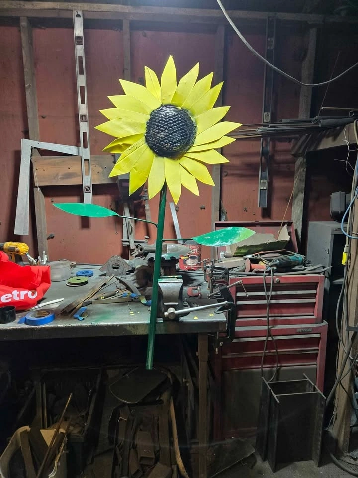 Add a bold, unique statement to your garden or patio with this one-of-a-kind handcrafted metal sunflower. Standing at a striking height, this piece is built to last and designed to catch the eye. Key Features: Eco-Friendly: Expertly crafted from 100% recycled/reclaimed metal materials, including a heavy-duty mesh center and industrial-grade steel petals. Artisan Quality: Hand-welded with a rugged, textured finish that celebrates its industrial roots. Weather Resistant: Painted in a vibrant sunflower yellow and deep forest green to brighten up your outdoor space all year round. Sturdy Design: Mounted on a thick metal stake for easy installation in a garden bed or large planter. This isn't your average store-bought plastic decor. It’s a heavy, durable piece of local art that will "bloom" even in the middle of winter! Dimensions: (flower is approximately 24", Approx. 4ft tall). Pickup: Convenient pickup in Trenton. Support local makers and give recycled metal a beautiful new life!