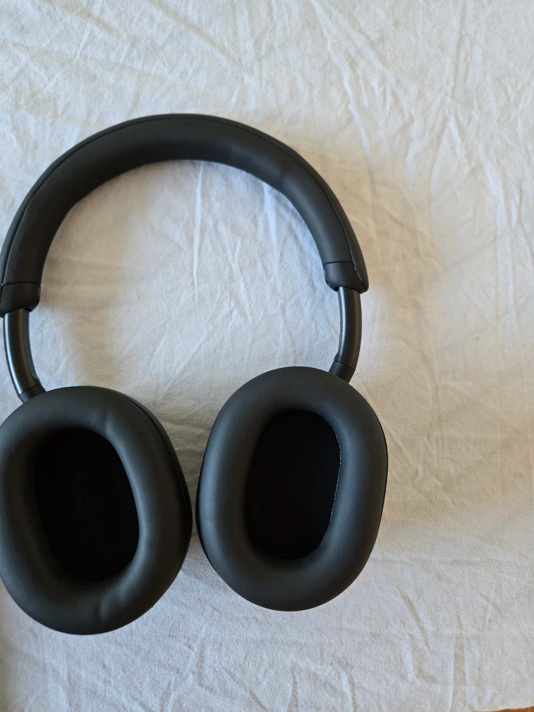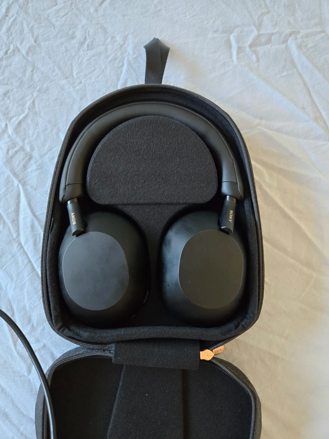 Sony WH-1000XM5 over-ear headphones in black. Includes carrying case and charging cable. Excellent noise-cancelling technology. These are wireless headphones heaven!
