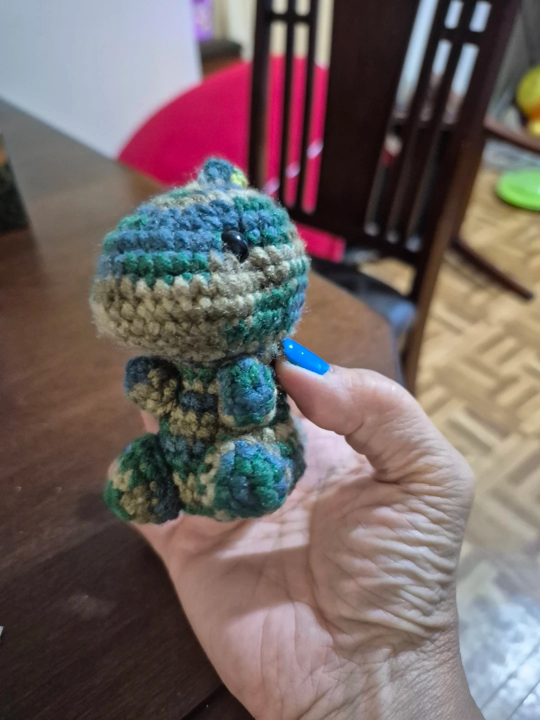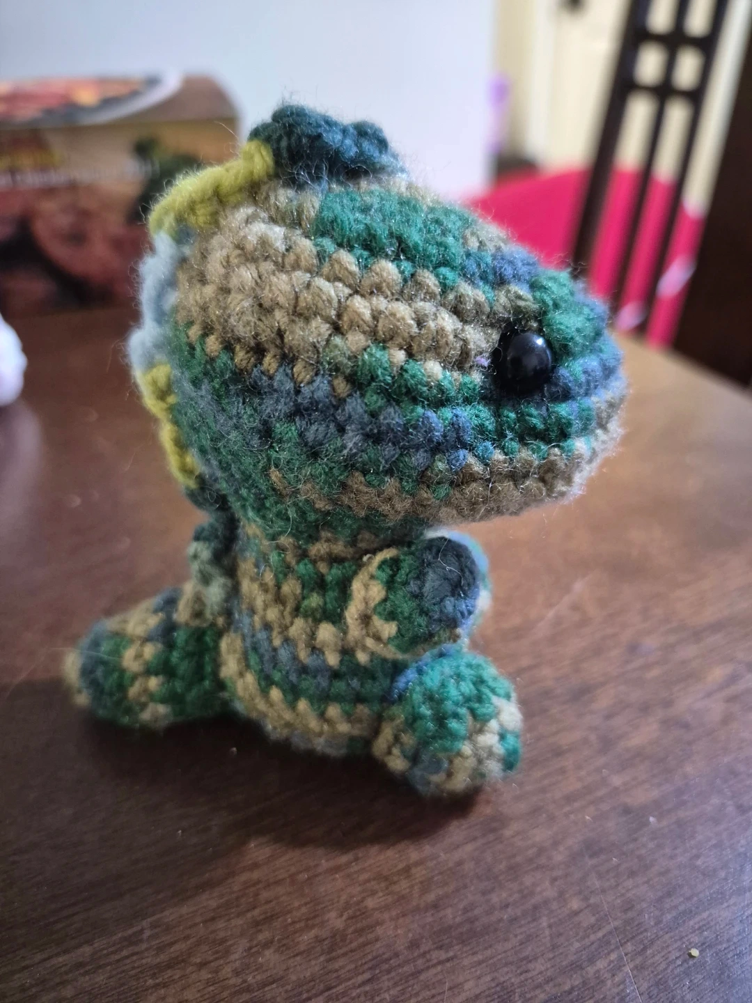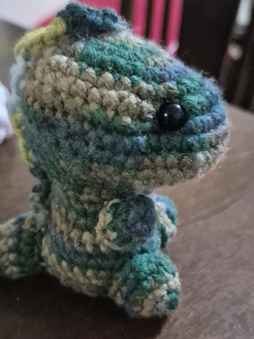 A cute, handmade dinosaur plush toy. It's crocheted with yarn in a camouflage pattern of greens, blues, and browns. The eyes are black beads, and it's about the size of a palm.