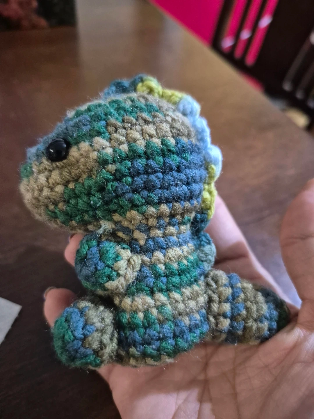 A cute, handmade dinosaur plush toy. It's crocheted with yarn in a camouflage pattern of greens, blues, and browns. The eyes are black beads, and it's about the size of a palm.