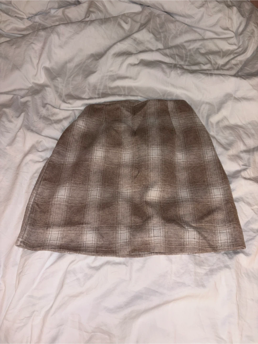 This is a stylish plaid mini skirt. It's a brown and white checkered pattern. The material feels soft and warm, making it great for cooler weather!