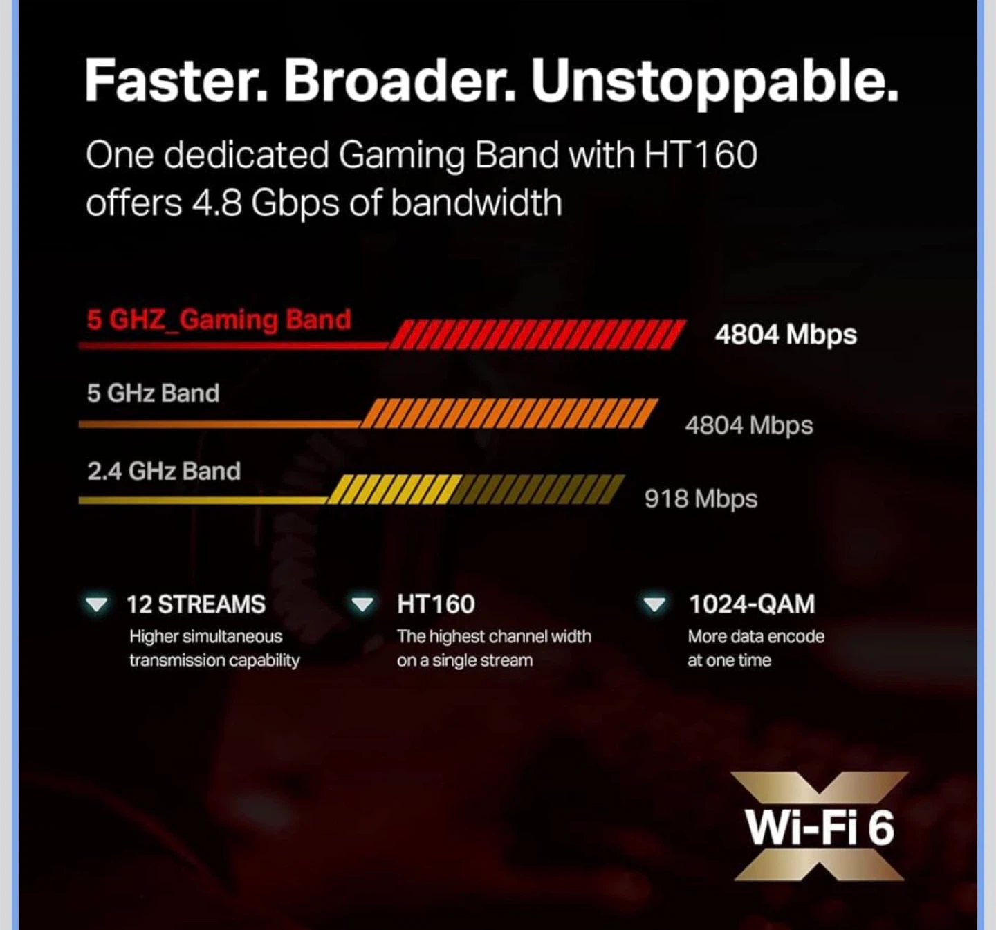 Ultra-Fast WiFi for Extreme Gaming: AX11000 speed machine that delivers 12-streams WiFi speeds over 10 Gbps: 4804Mbps on 5GHz for gaming, 4804Mbps on 5GHz, and 1148Mbps on 2.4GHz