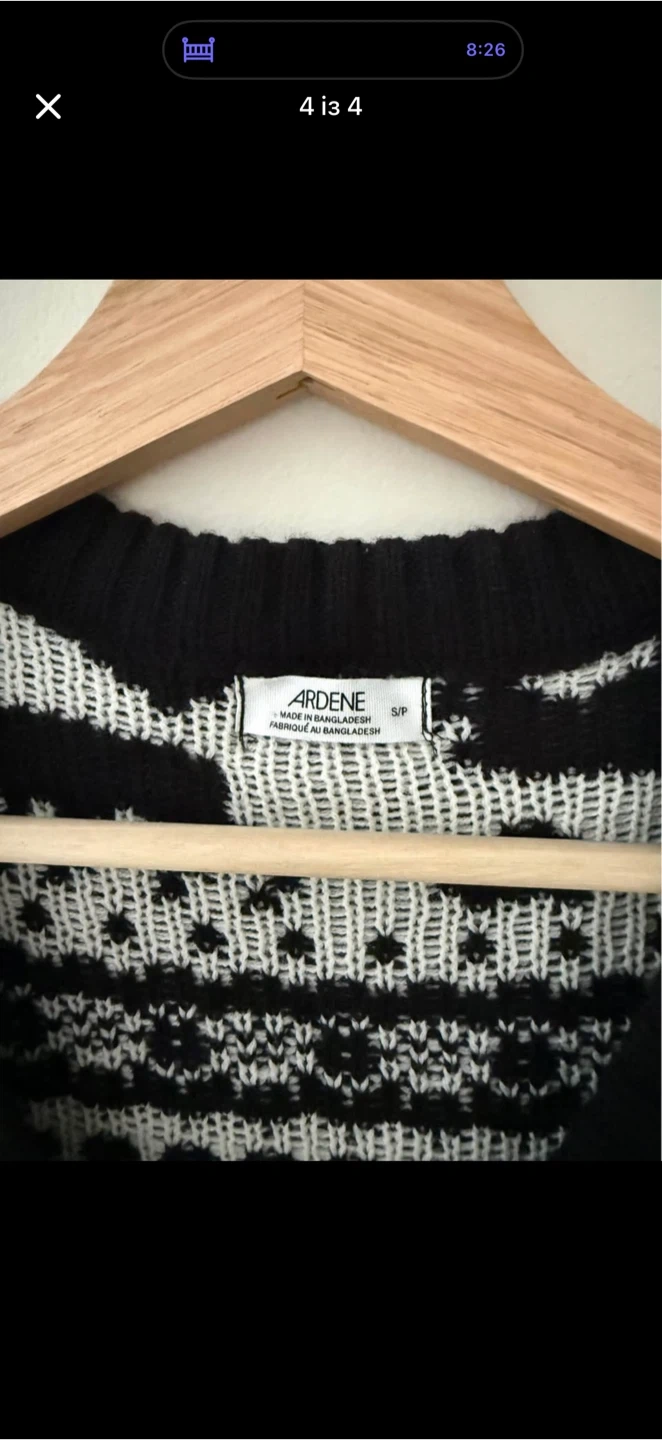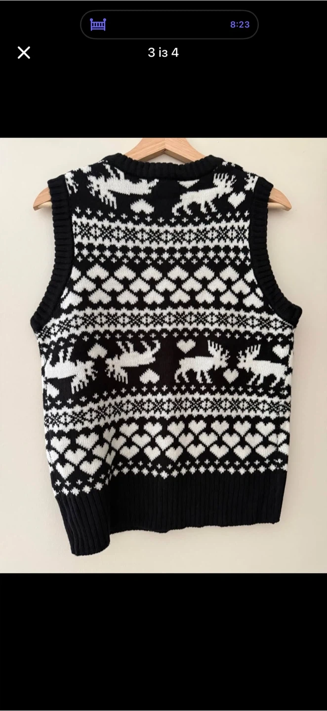 This Ardene knit vest features a fun black and white Fair Isle pattern with moose. It's a sleeveless design with a V-neck. The size is S/P.