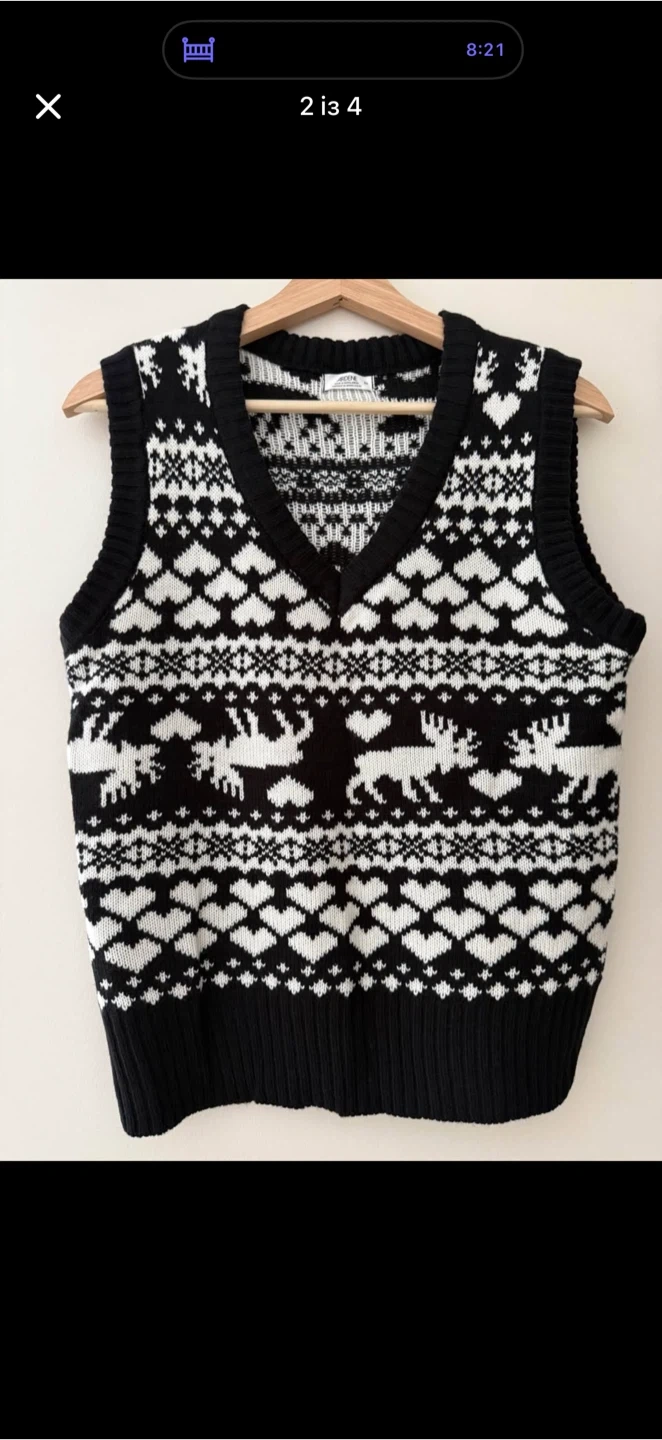 This Ardene knit vest features a fun black and white Fair Isle pattern with moose. It's a sleeveless design with a V-neck. The size is S/P.